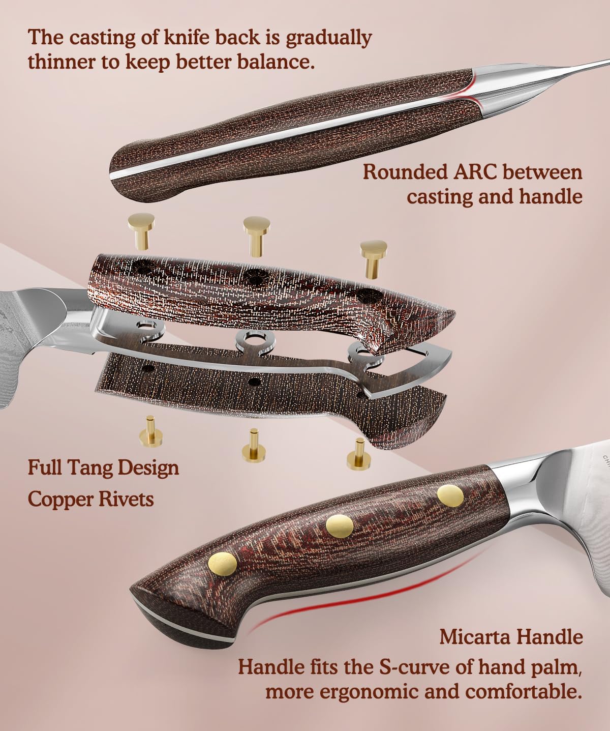 • [Ergonomic Micarta Handle] Expertly crafted from high-pressure laminated resin and fabric for superior durability and abrasion resistance; Features a smooth yet secure textured grip that fits naturally in hand, perfect for prolonged use with kitchen, outdoor, and folding knives; The non-porous surface repels moisture and stains while remaining effortless to clean; Built with a full-tang, one-piece forged construction and reinforced with solid copper rivets for unmatched strength and heavy-duty performance
