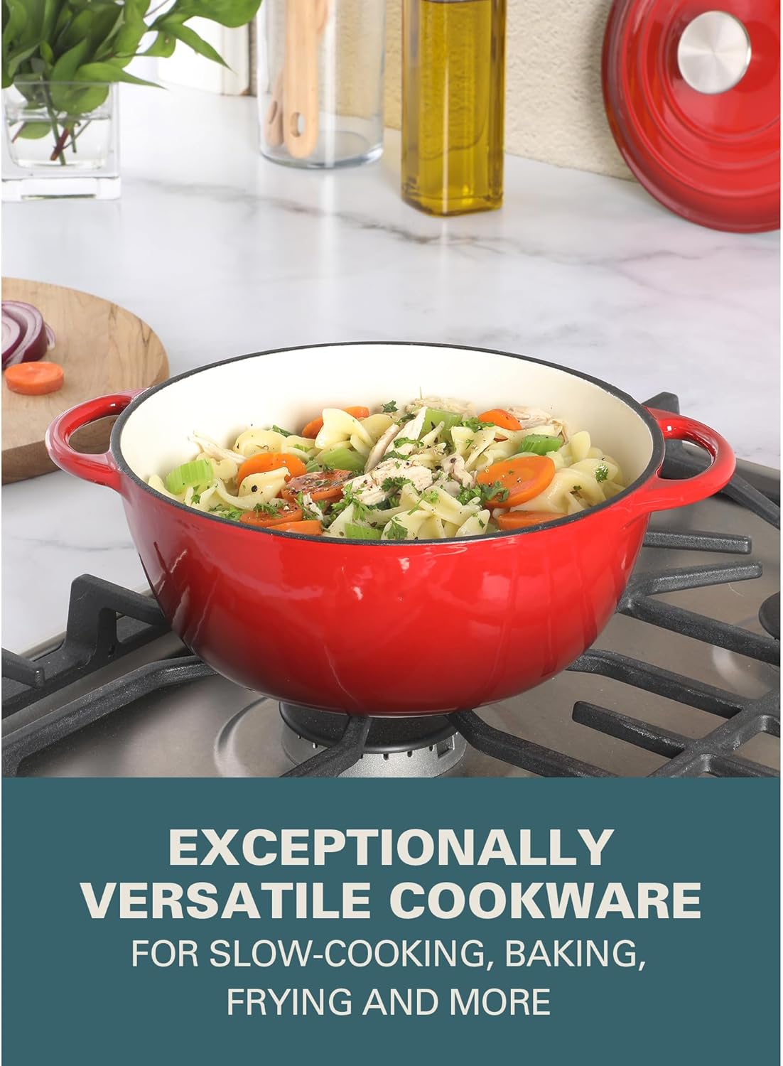 • BEST IN VERSATILITY: Cast iron Dutch oven is an exceptional piece of cookware to braise and bake, fry and sauté, simmer and serve. Heavy-duty construction promotes superior heat distribution and retention.