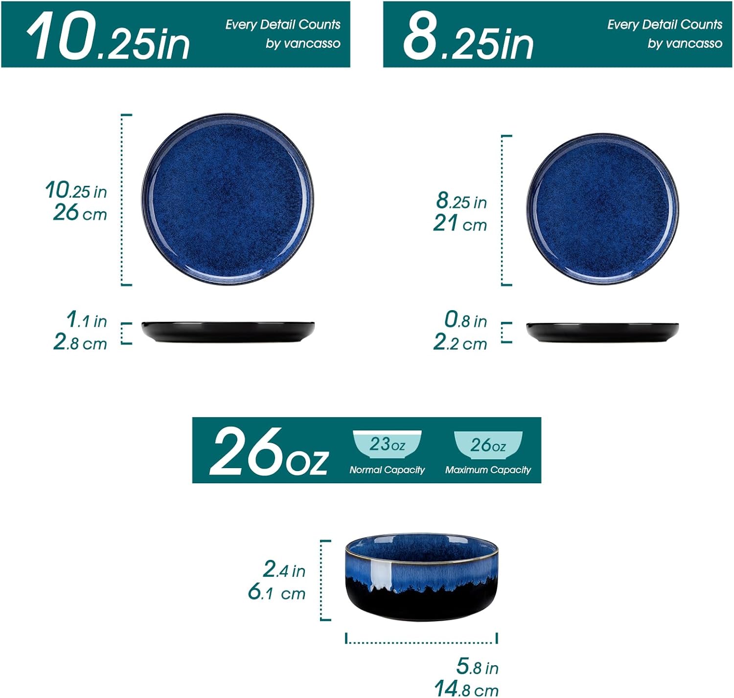 vancasso Starry 12 Pieces Dinnerware Sets for 4, Blue Reactive Glaze Dishes Sets, Ceramic Plates and Bowls Set, Dinner Salad Dessert Plates, and Cereal Bowls Set, Dishwasher and Microwave Safe