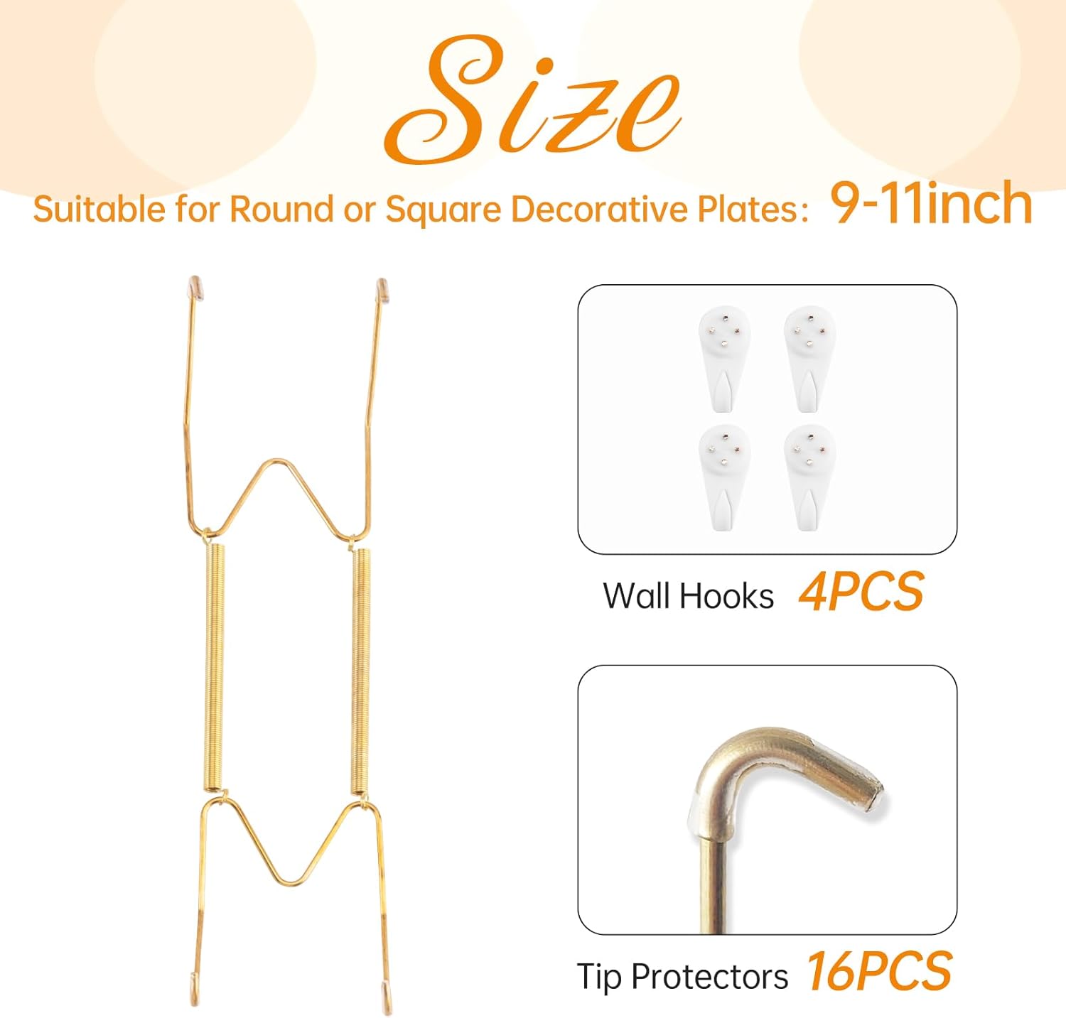 • Package Inclusion: Our package includes 4 wall plate hangers, 4 wall hooks, 16 rubber tip protectors, 1 instruction, fit for holding 9-11 inch round or square plates. You can create a variety of arrangements to decorate your plates to fully meet your hanging and display requirements.