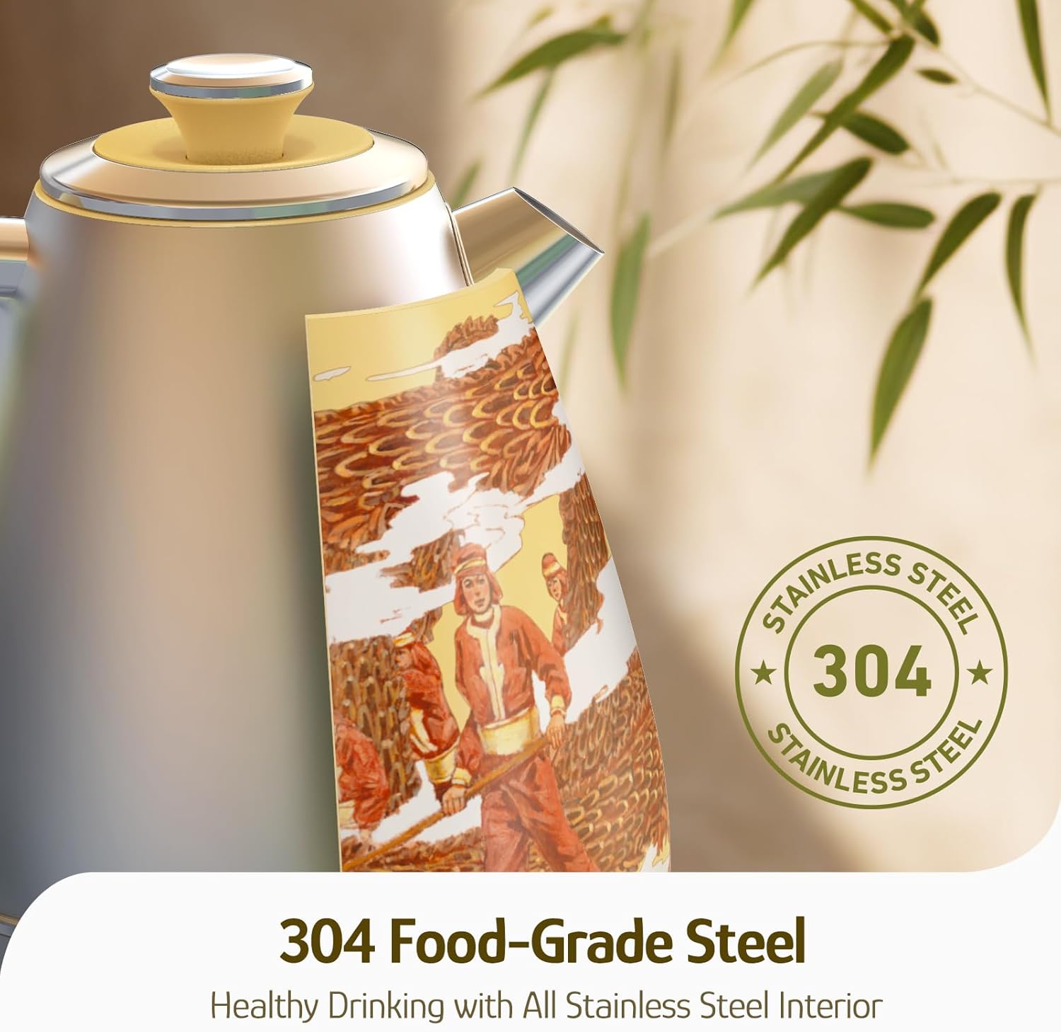 • All Stainless Steel: This retro electric kettle is crafted with food-grade 304 stainless steel in its interior, lid, and filter. It has no plastic in contact with the water, providing you and your family with BPA-free healthy drinking.