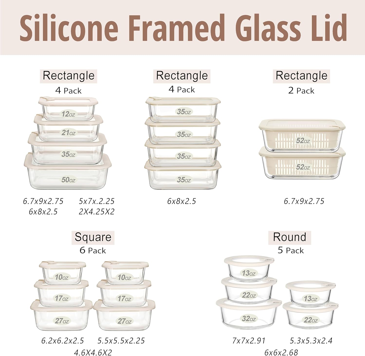 • ✅WHAT’S IN THE BOX: Each set comes with the Glass containers and their matching Silicone Framed Glass Lids. Round Shape in 5 Pack Convenient Size : 1set of 32oz, 2 sets 22oz, 2 sets of13oz. There are more sizes, colors, and shapes in other combo sets