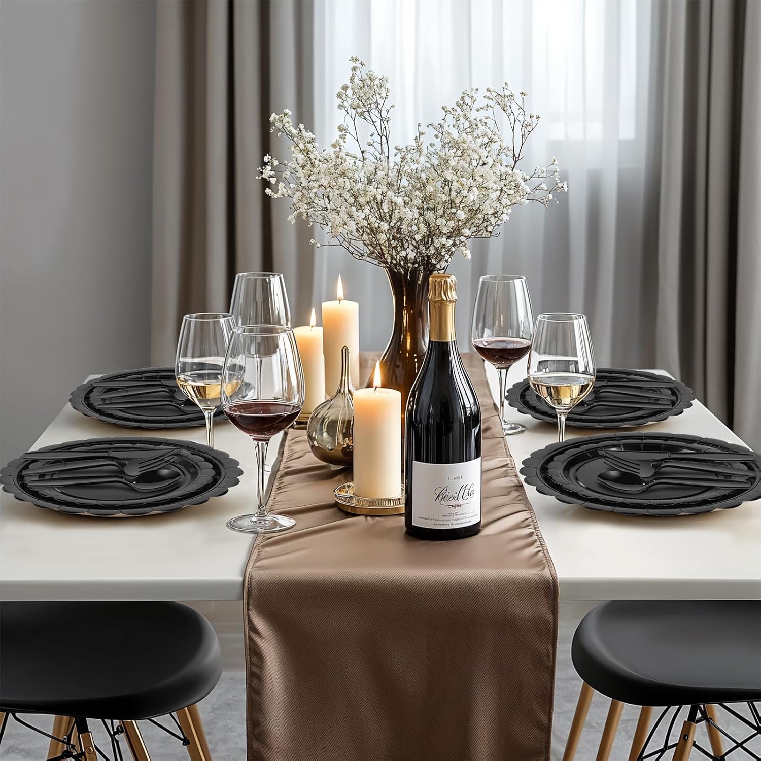 • Elegant Scalloped Rim Design:The edges of black plates and napkins are designed with scalloped pattern, which highlights the elegance and beauty of the tableware and can better decorate the party table