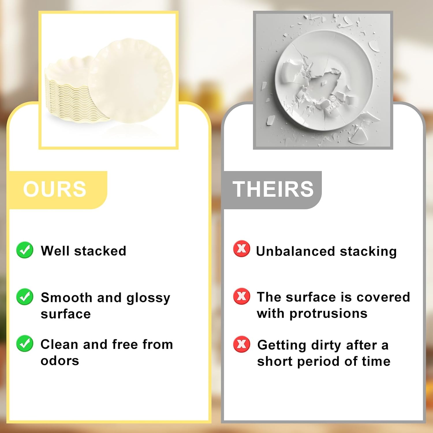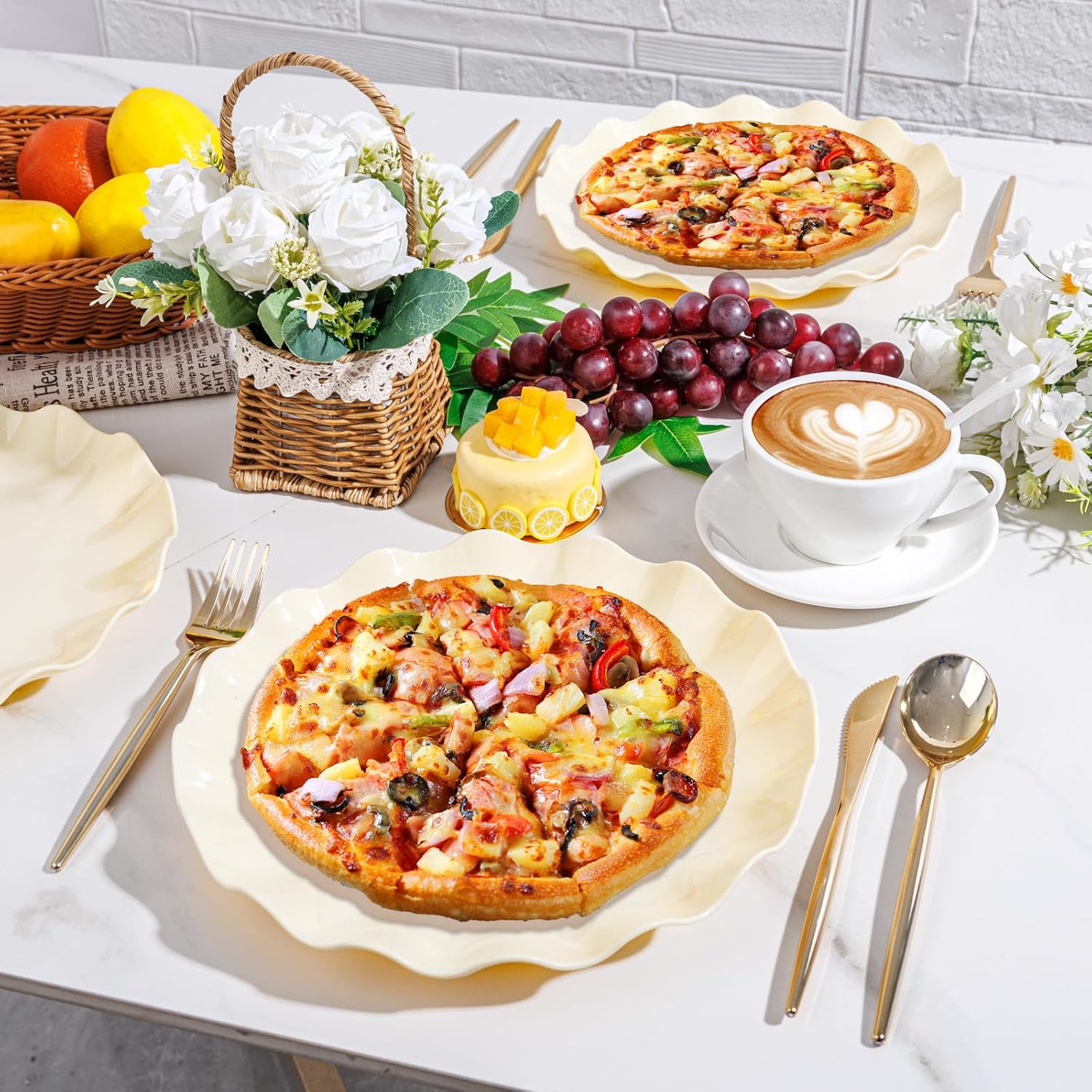 • 【Light luxury Beige plastic plates】The classic plastic plates reusable,paired with exquisite scalloped edges,instantly elevates the dining table style for weddings,bridal showers,or holiday parties creating a high-end banquet visual experience.The unique beige and yellow color scheme perfectly blends with themed decorations such as weddings,creating a relaxed and luxurious atmosphere for buffet and dinner tables!