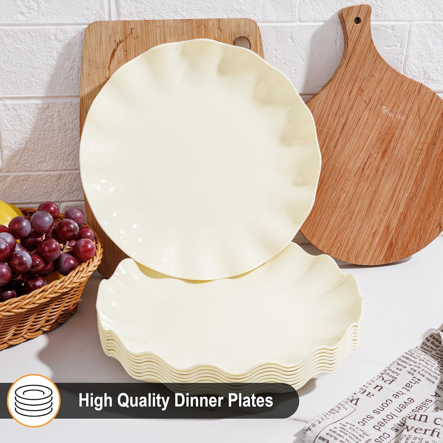 LIYH 20 Pcs 10 Inch Beige Plastic Plates Reusable - Unbreakable Plastic Scalloped Wavy Dinner Plates for Baby Shower Camping Party Outdoor Picnics Dishwasher Safe BPA Free