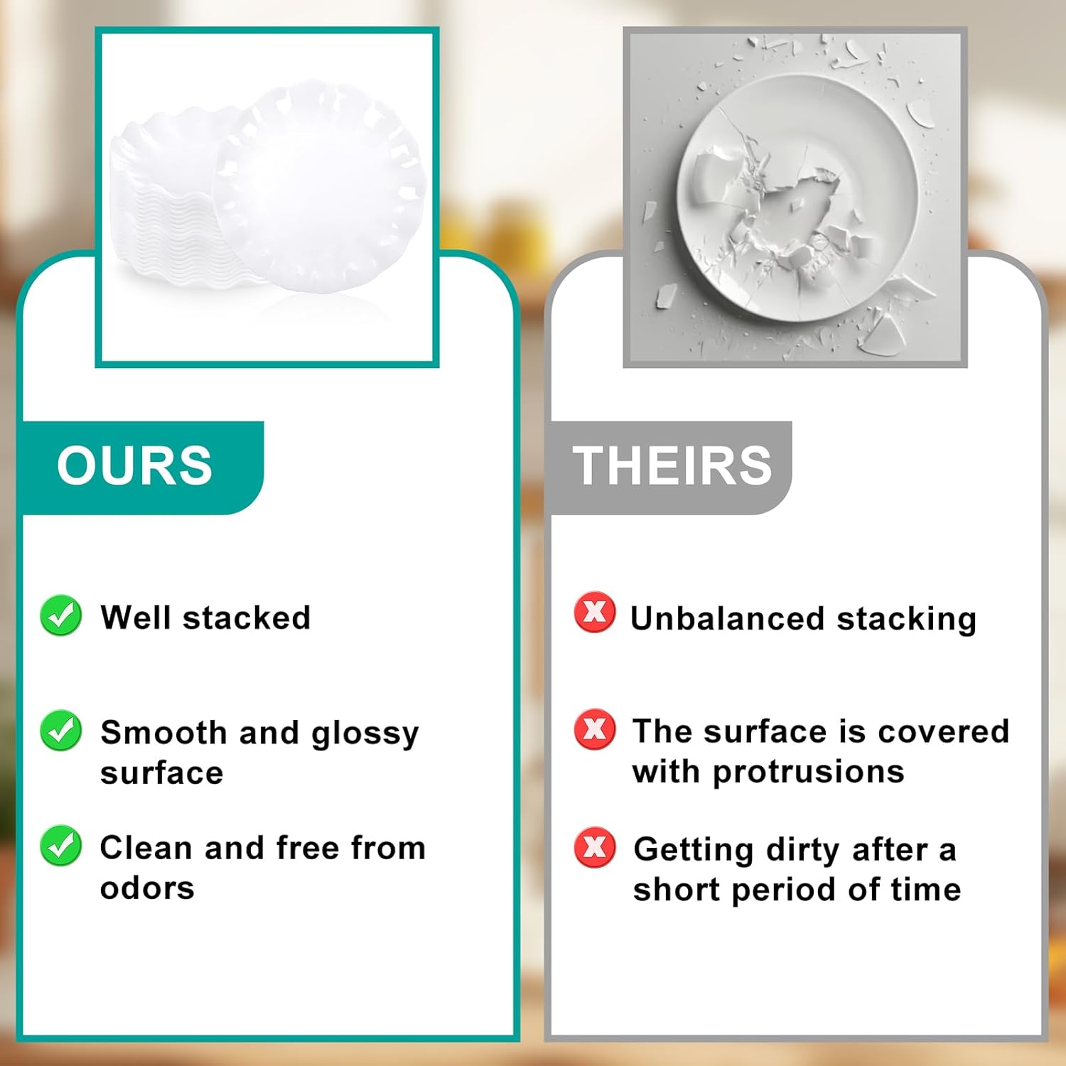 • 【Pure White Scalloped Design】The classic white plastic plates body is paired with exquisite scalloped edges design to create a visual experience of high-end tableware sets.Whether it's wedding table decoration,formal dinner plates,or outdoor camping,easily create an elegant dining atmosphere and bid farewell to the rough feeling of cheap paper!
