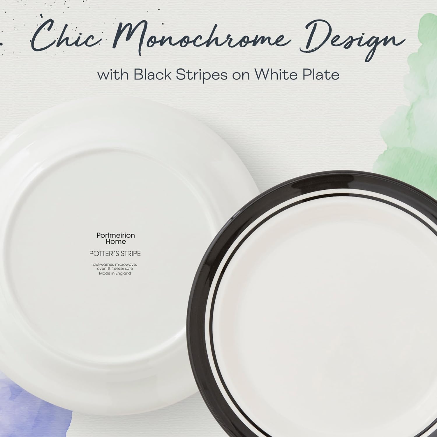 • Refined Black Stripe: The Portmeirion Potter's Stripe Dinner Plate Set features a double-striped black rim, creating a sophisticated look that enhances both modern tableware and traditional settings.