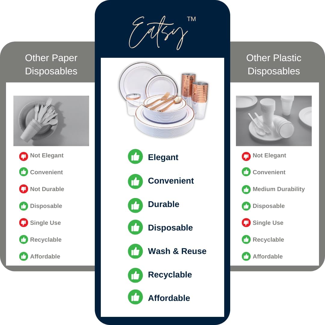 • COMPLETE, ELEGANT, CONSISTENT THEME: Consists 150 pieces of dinnerware that can cater up to 25 guests, depending on the chosen size. It includes: dinner plates, dessert plates, cutlery (spoon, fork, knife), and cups. It contains matching tableware to elevate your next dinner experience. Whether it's a birthday, wedding, Thanksgiving, Hanukkah, Christmas, New Year Countdown party, Eatsy can make the occasion feel extra special.
