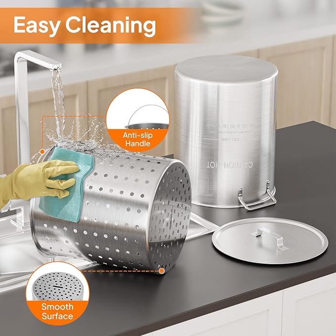 • πŸ— Large 30QT Capacity: Our pot boasts a generous 30-quart capacity, perfect for cooking large quantities of food. Ideal for family gatherings, parties, and commercial use, it easily accommodates seafood boils, whole turkeys for frying, or multiple portions of soups and stews