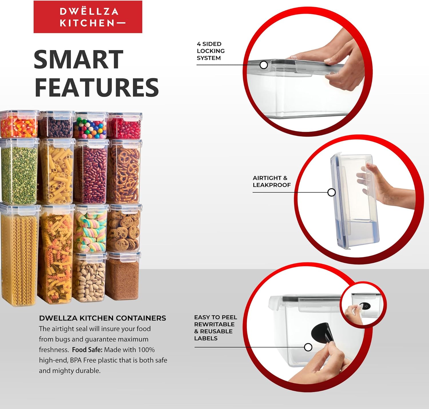 • Airtight Seal to Keep Food Fresh: The Side-Locking Lids Ensure That No Air or Water Goes Into Your Favorite Snacks And That They Should Stay Super Fresh And Dry. These Plastic Food Storage Containers With Lids Are Very User Friendly, Easy to Clean, and Dishwasher Safe.