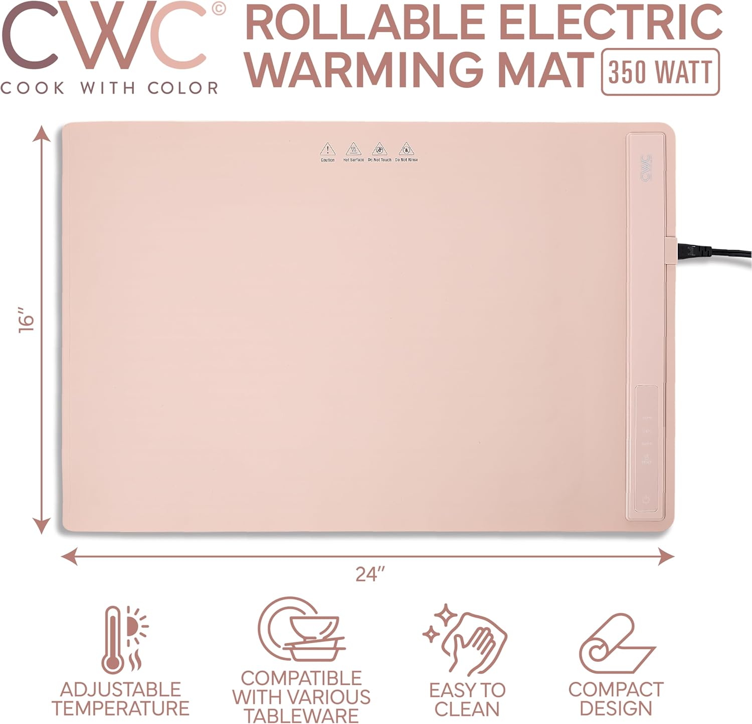 COOK WITH COLOR 350W Electric Food Warming Mat - Portable Food Warmer Tray with Adjustable Temperature, Fast 60-Second Heating, Auto Shut-Off, Rollable Silicone Pad for Parties & Everyday Use, Blush