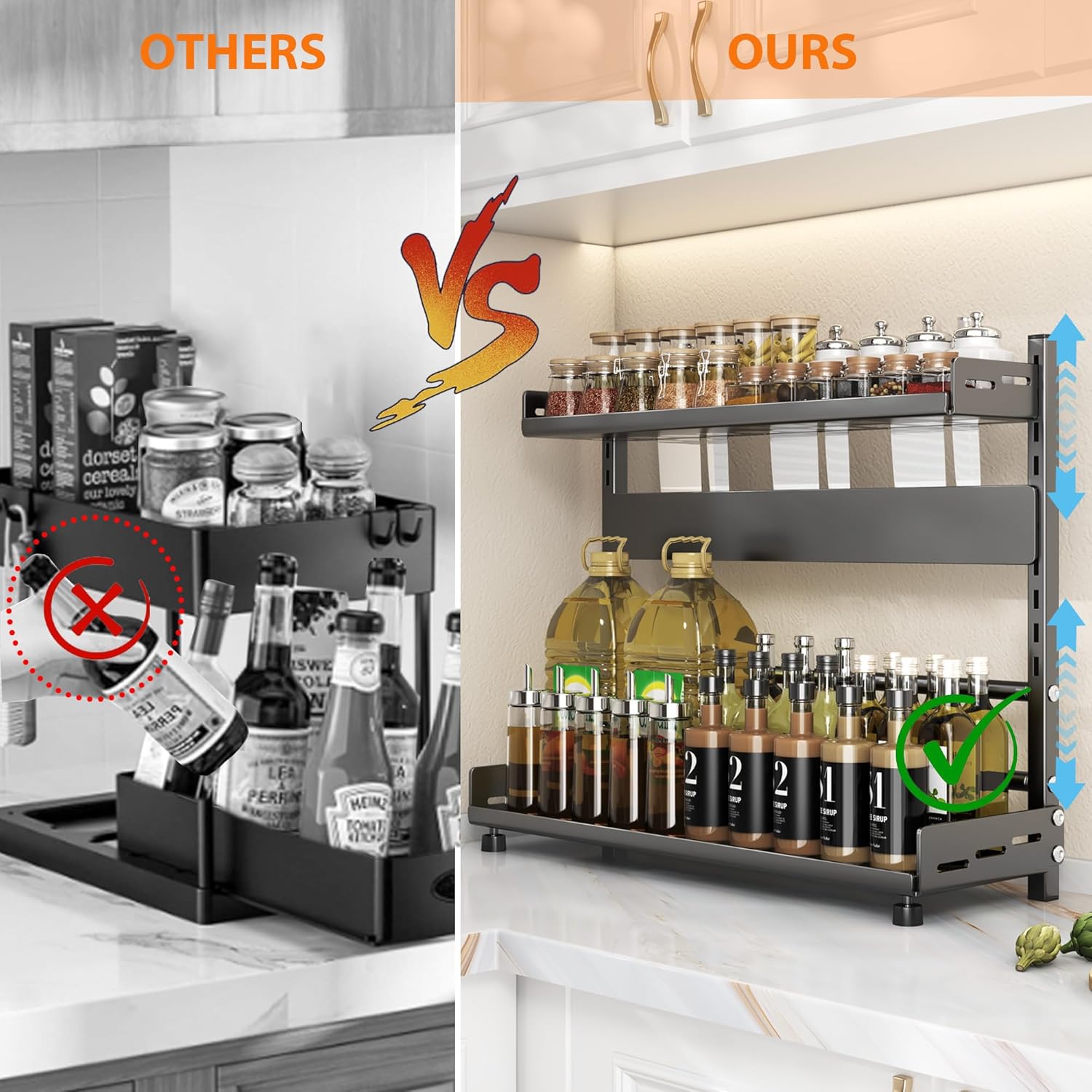• ✨【Versatile Use】Save your counter space! This height-adjustable spice rack organizer shelves helps you utilize in any area of the house to store, sort, and easily organize items. Usable in kitchen, bathroom, cabinets, shelves, pantry and more. Save the time and hassle of searching through cabinets for desired ingredients and spices.