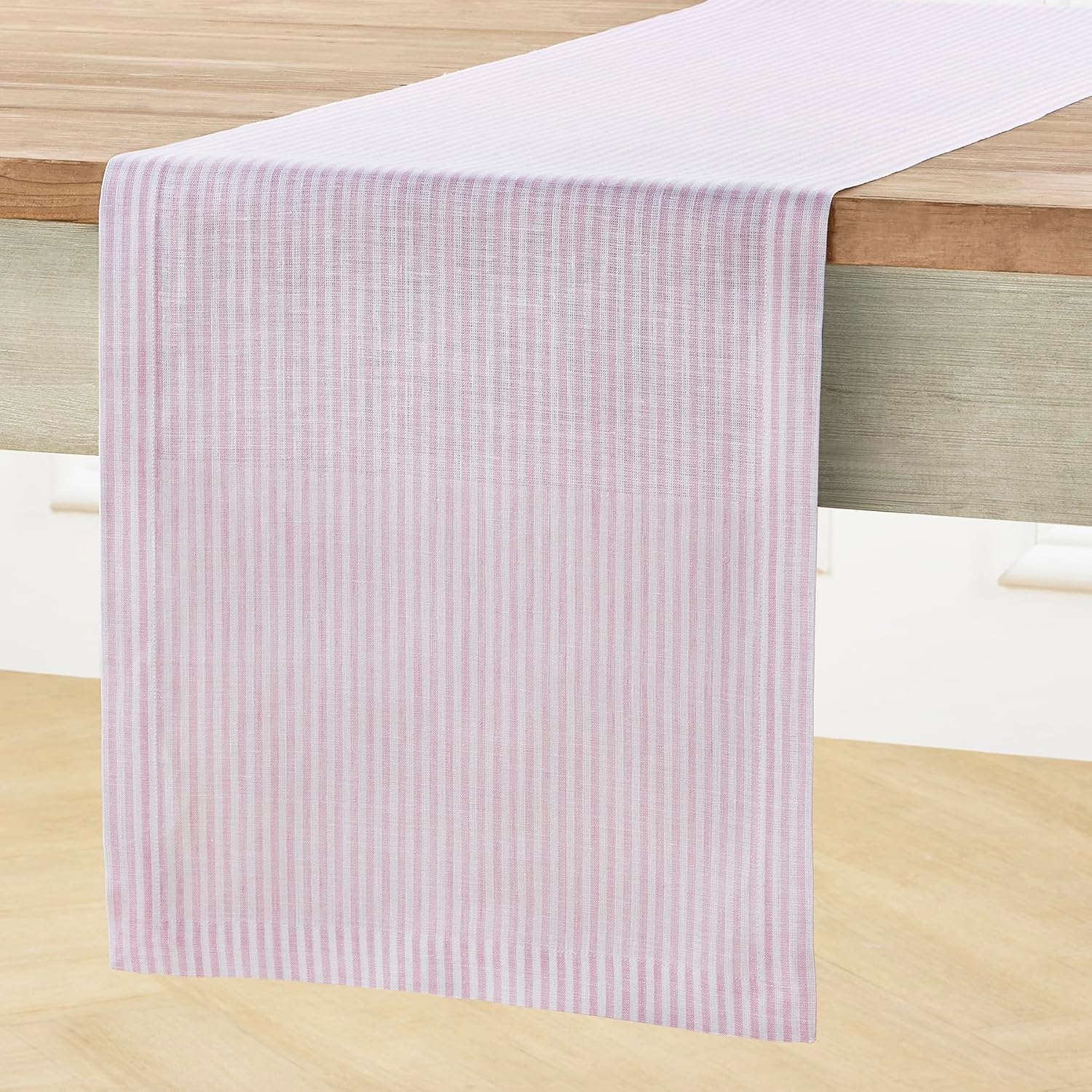 Solino Home Linen Table Runner 48 Inches - Narrow Stripe 100% Pure Linen Pink and White Table Runner 14 x 48 Inch Ideal for Dresser and Coffee Tables - Halloween