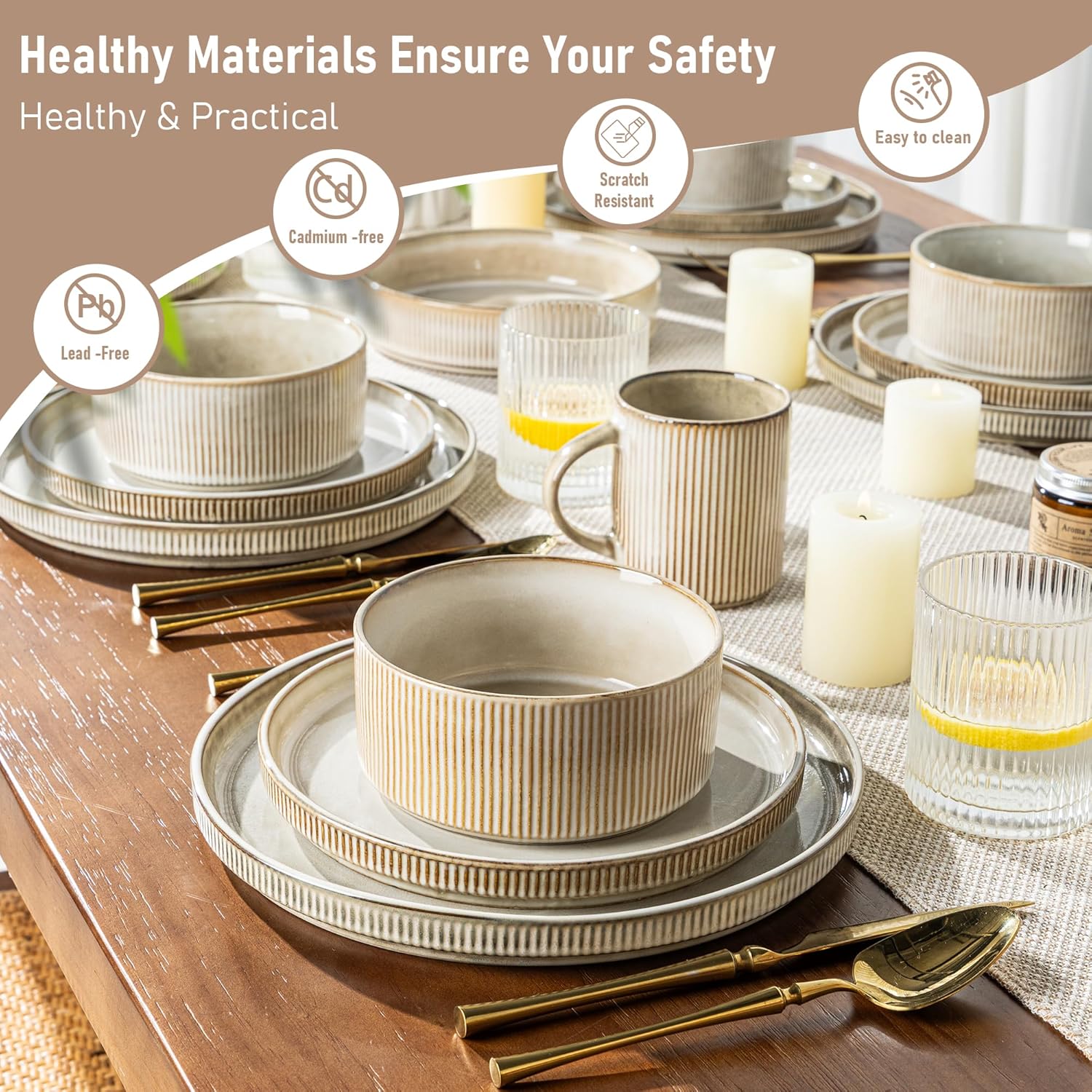 • Healthy, Lead & Cadmium-Free:Crafted from premium organic natural clay and double-fired, this stoneware dinnerware set is free from lead and cadmium—ensuring no harmful chemicals ever leach into your food. Durable and chip-resistant, it’s made to withstand everyday use while staying beautiful year after year.