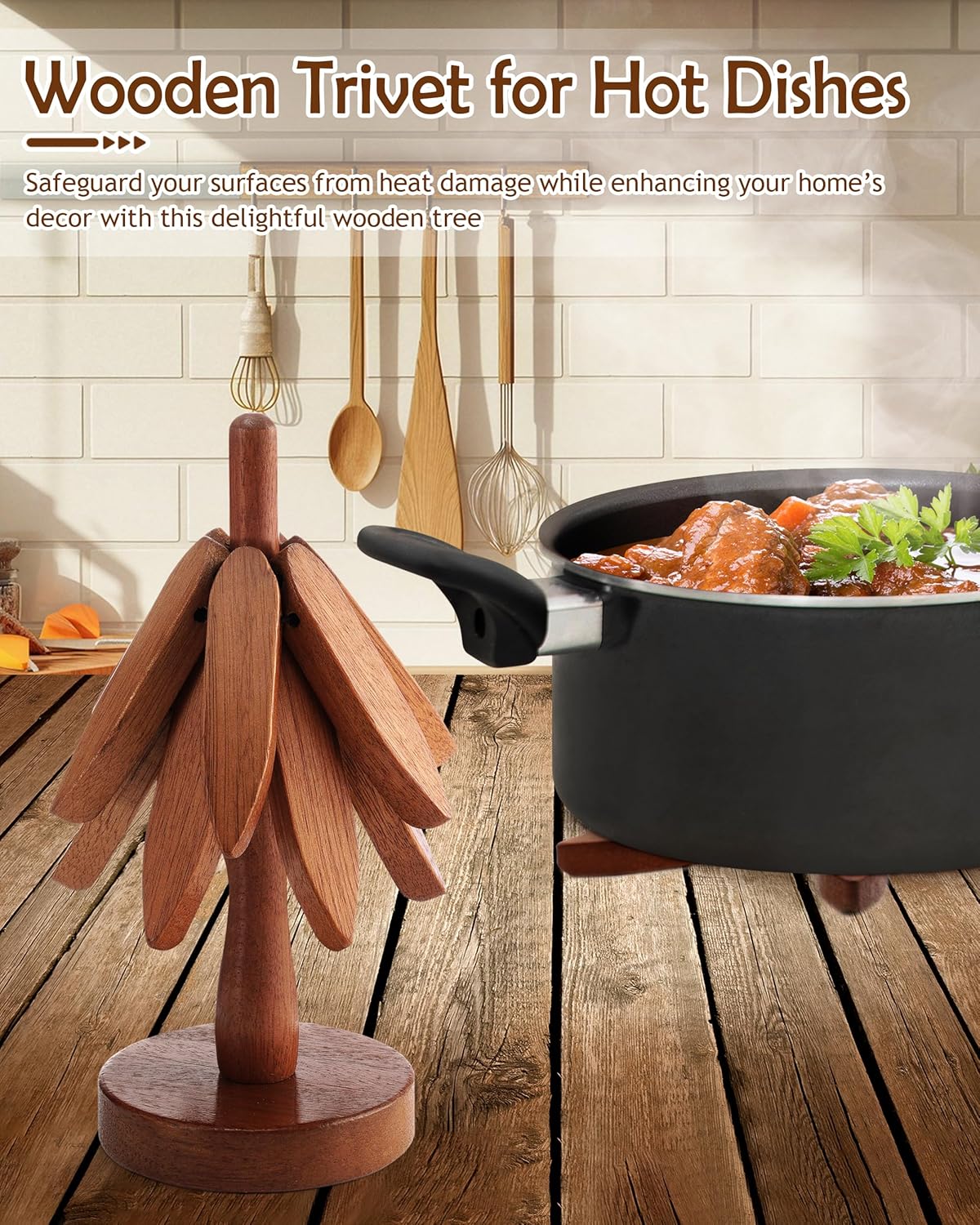 • Simple yet Fun: Explore our wood trivet featuring an automatic folding mechanism. Easily expand with a simple push, adding a touch of excitement to your kitchen routine.
