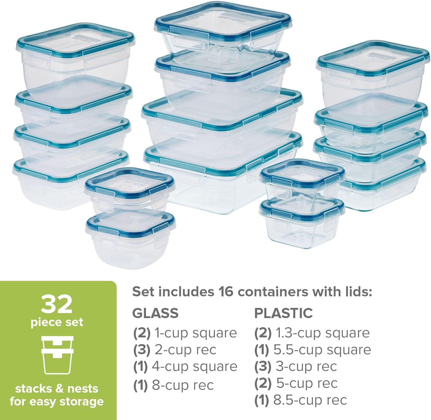 Snapware Total Solution (16-Pack) Glass & Plastic Mix Food Storage Containers Set, Meal Prep Containers with BPA-Free Lids & 4 Locking Tabs, Microwave, Dishwasher, and Freezer Safe