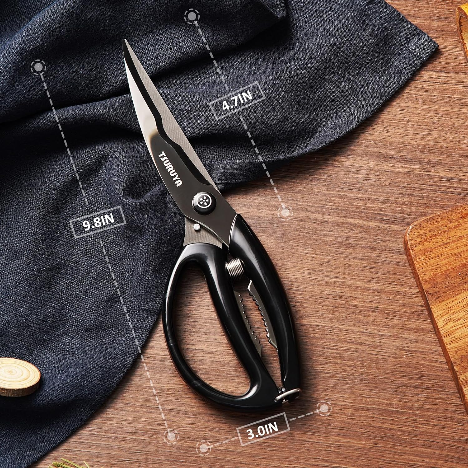 • Ultra Sharp Blade: The blade of heavy duty kitchen shears is made of titanium plated stainless steel, which is ultra sharp to ensure precision cutting and not easy to rust. It is strong enough with excellent corrosion resistance and high wear resistance. 1 Blade designed with grooves and micro-serrated teeth to ensure food from slipping. We suggest you cut poultry bone or hard shell food in osteotomy area, use the front end of the blade to cut soft stuff, like fresh meat
