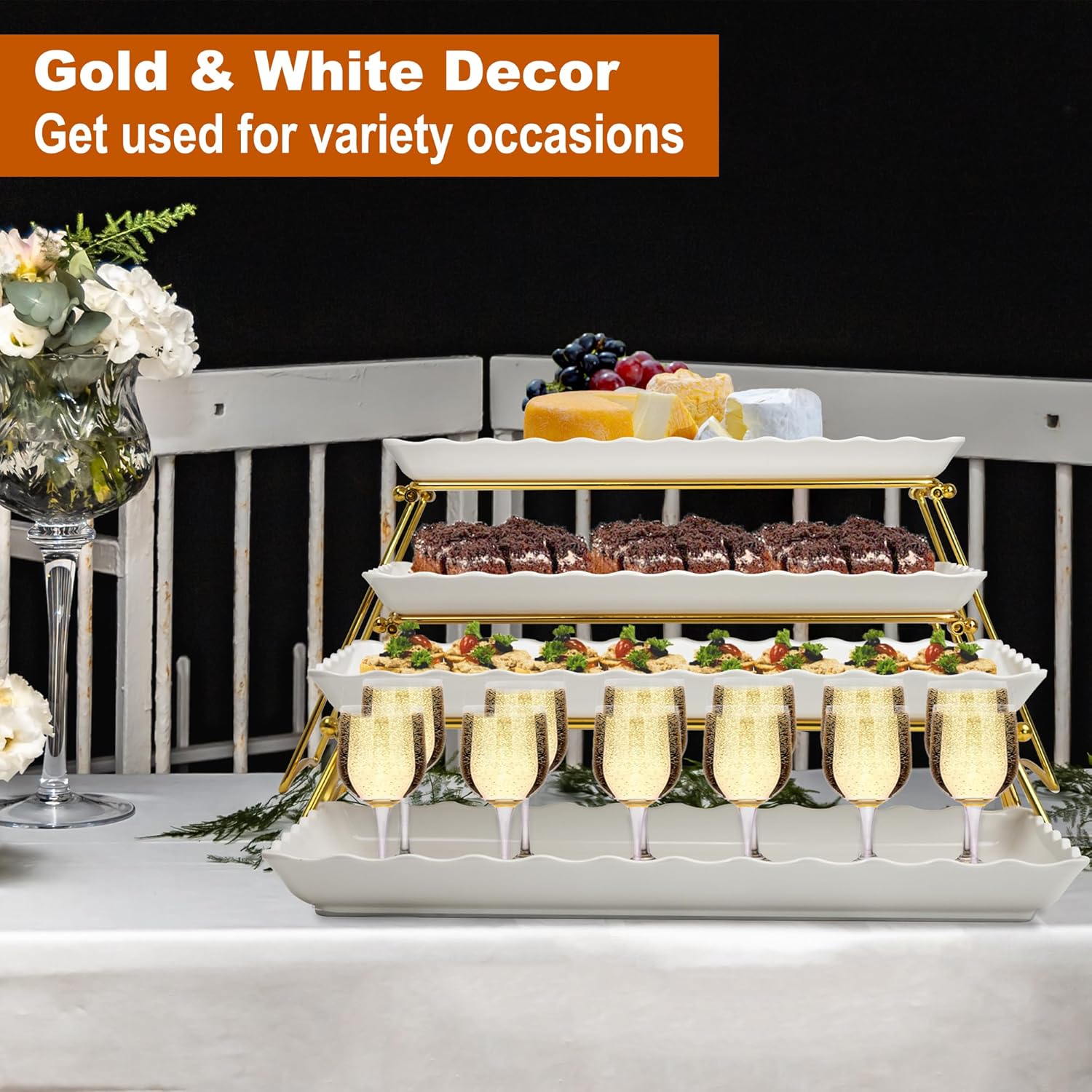 • VERSATILE TIERED SERVING STAND GETS USED FOR ANY OCCASIONS: The food stand adds height to your tablescape, makes the food appear more appealing. Enhanced any special event with this elegant serving platter set for party. It's perfect for birthdays, weddings, Bridal Shower, anniversary, holidays, hospitality business, kids and adult parties, formal gatherings, dances balls, buffets, dessert bar, retirement party and more entertaining. There is no limit but your imagination on how to use these trays and stands, either together or apart