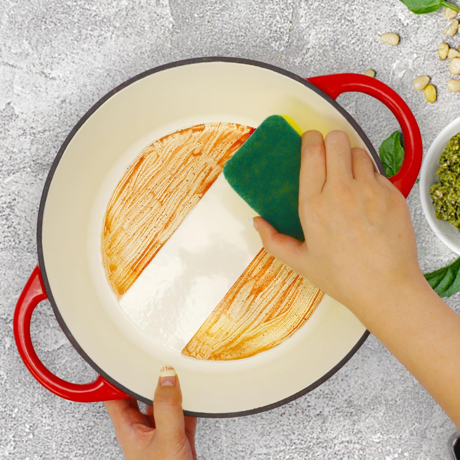 • EASY TO CLEAN: This Dutch oven is coated with non-stick coating, just gently wipe it with a soft sponge or rag to remove food residue easily. If you want to remove hard-to-clean stains, soak it in warm water for 1 to 2 hours or longer, then wash it off with baking soda or a neutral detergent to protect the exterior shine and avoid using citrus cleaners