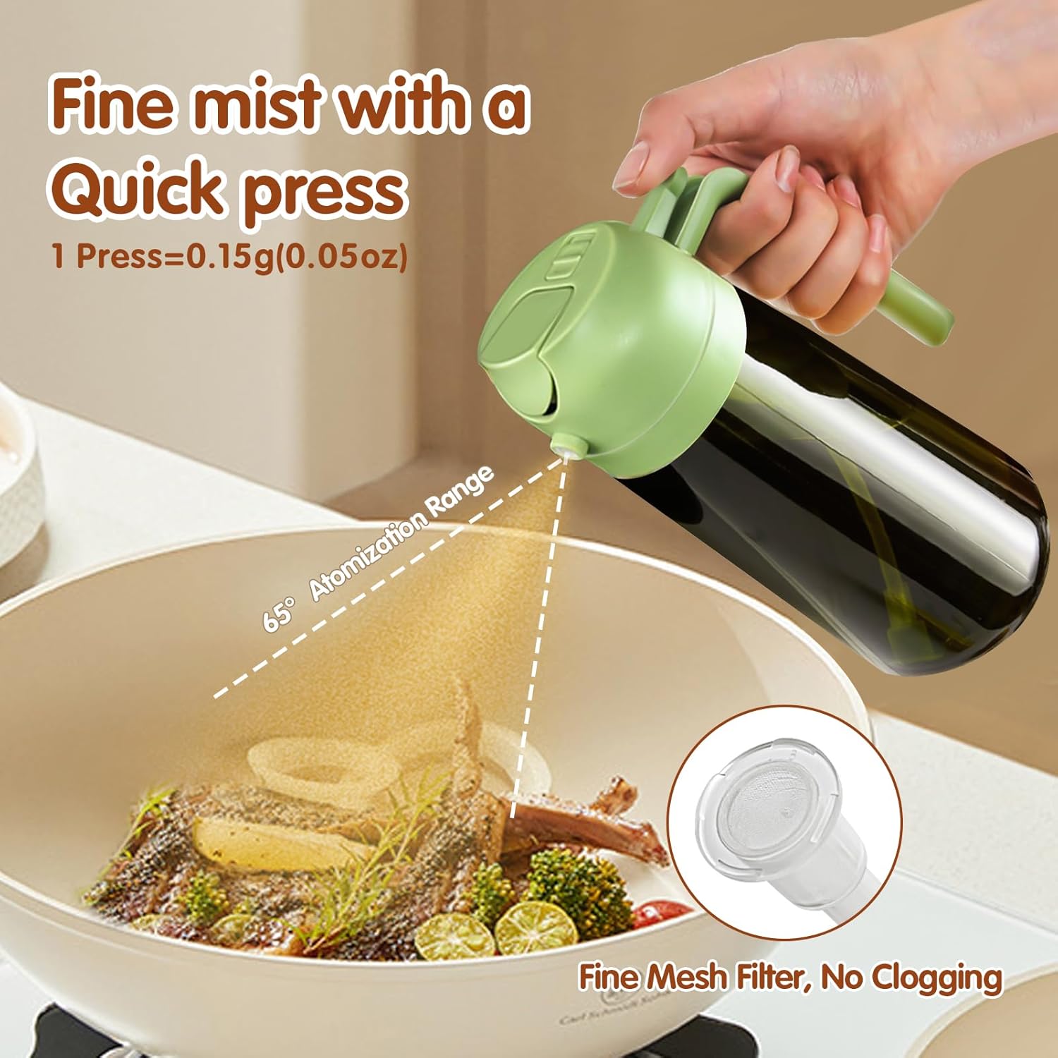 • 【Precise Oil Control】: 2 in 1 oil dispenser and oil sprayer can help to control the amount of oil while pouring or spraying. Each spray dispenses approximately 0.2 grams of oil, which is easily to control and measure your daily oil intake