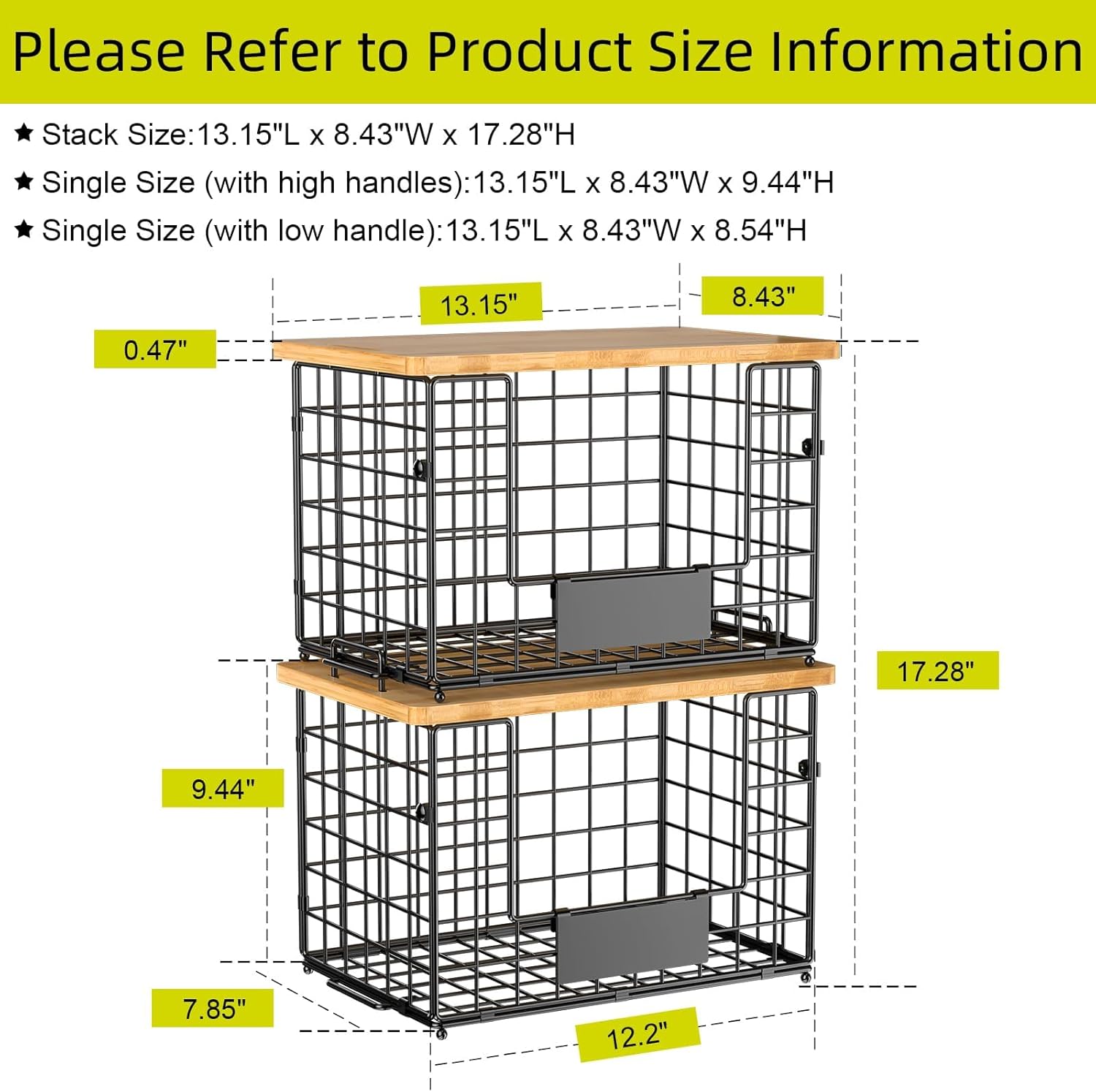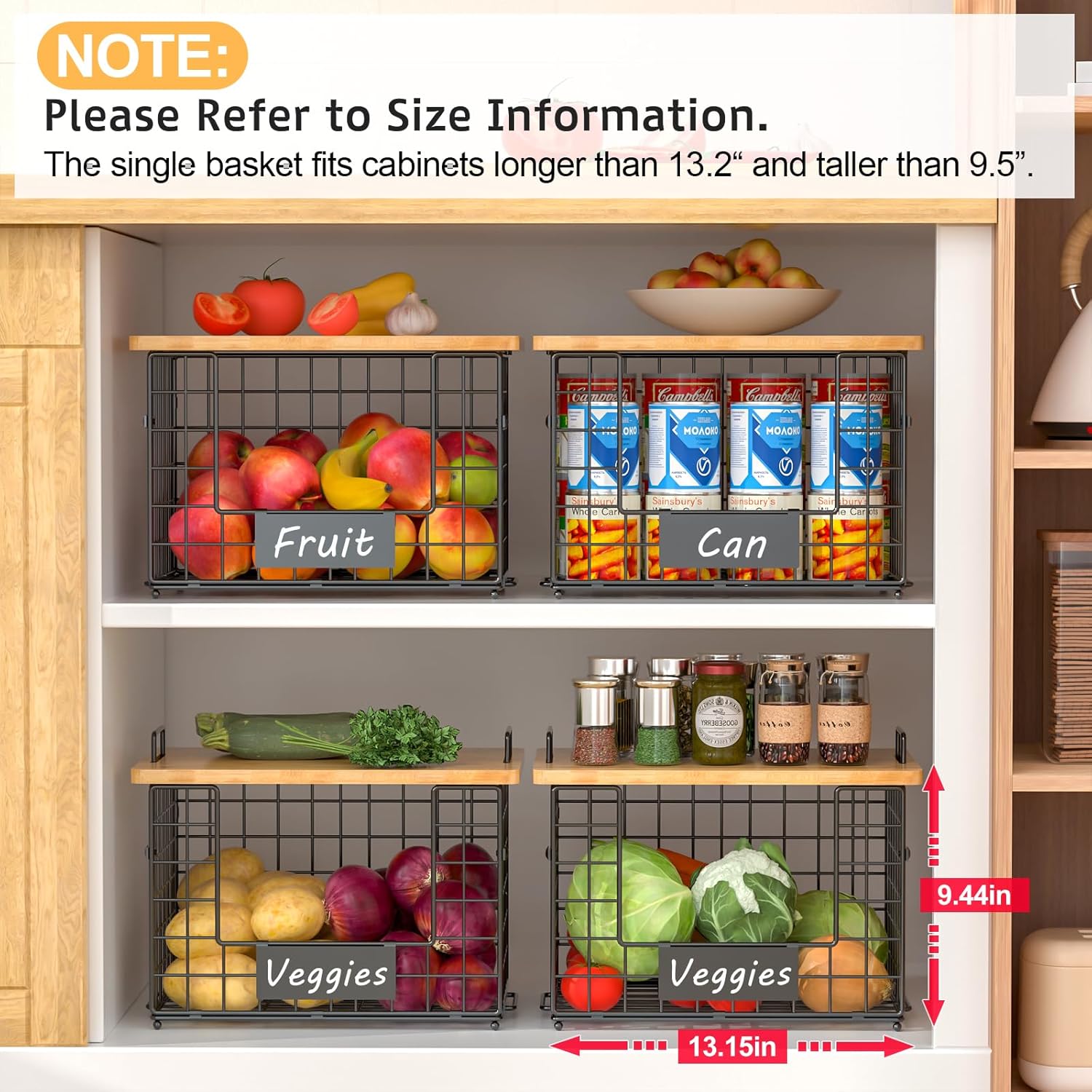 keomaisyto 2 Set XL Stackable Wire Baskets with Bamboo Top- Pantry Organizers and Storage, Kitchen Organization Counter Storage Bins for Potato/Onion/Fruit/Vegetable/Produce, Under Sink Organizing