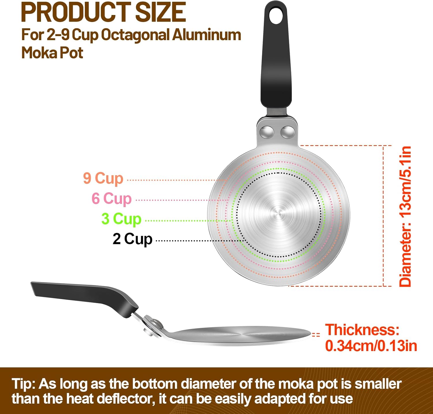 • Size: Induction heat guide plate is designed for various flat-bottomed cookware. The diameter is 13 cm/5.1 in, thickness is 0.34 cm/0.13 in. Before purchasing, please measure the diameter of the bottom of your pot to ensure a perfect fit. The heat transfer plate is equipped with a compact handle design, which is not only easy to pick up and move, but also easy to hang up and store, which greatly saves space in the kitchen and makes the kitchen more tidy and organized