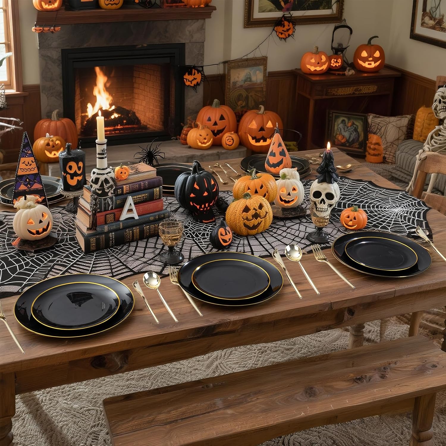 EI 180pcs Black Plastic Plates Black and Gold Disposable Plates Gold Plastic Dinnerware Set Silverware and Cups for Birthday,Wedding,Festival,Party Graduation,Halloween