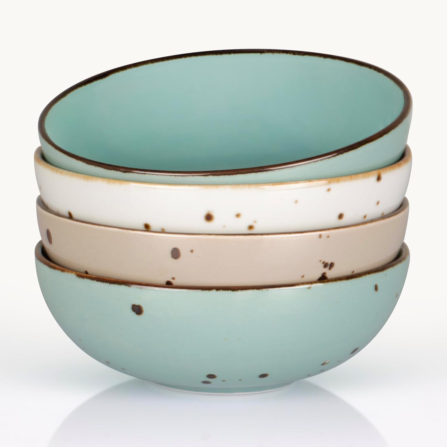 • MADE FOR HAPPY DINING: This ever-popular cottage-style porcelain salad bowl set of 4 makes a colorful addition to any modern or farmhouse decor. Our stoneware bowls are expertly painted with a reactive glaze, then kiln-fired to achieve a stunning, mottled effect that draws the eye and sets off any table setting, unlike ordinary and dull vivid dessert bowls on the market.
