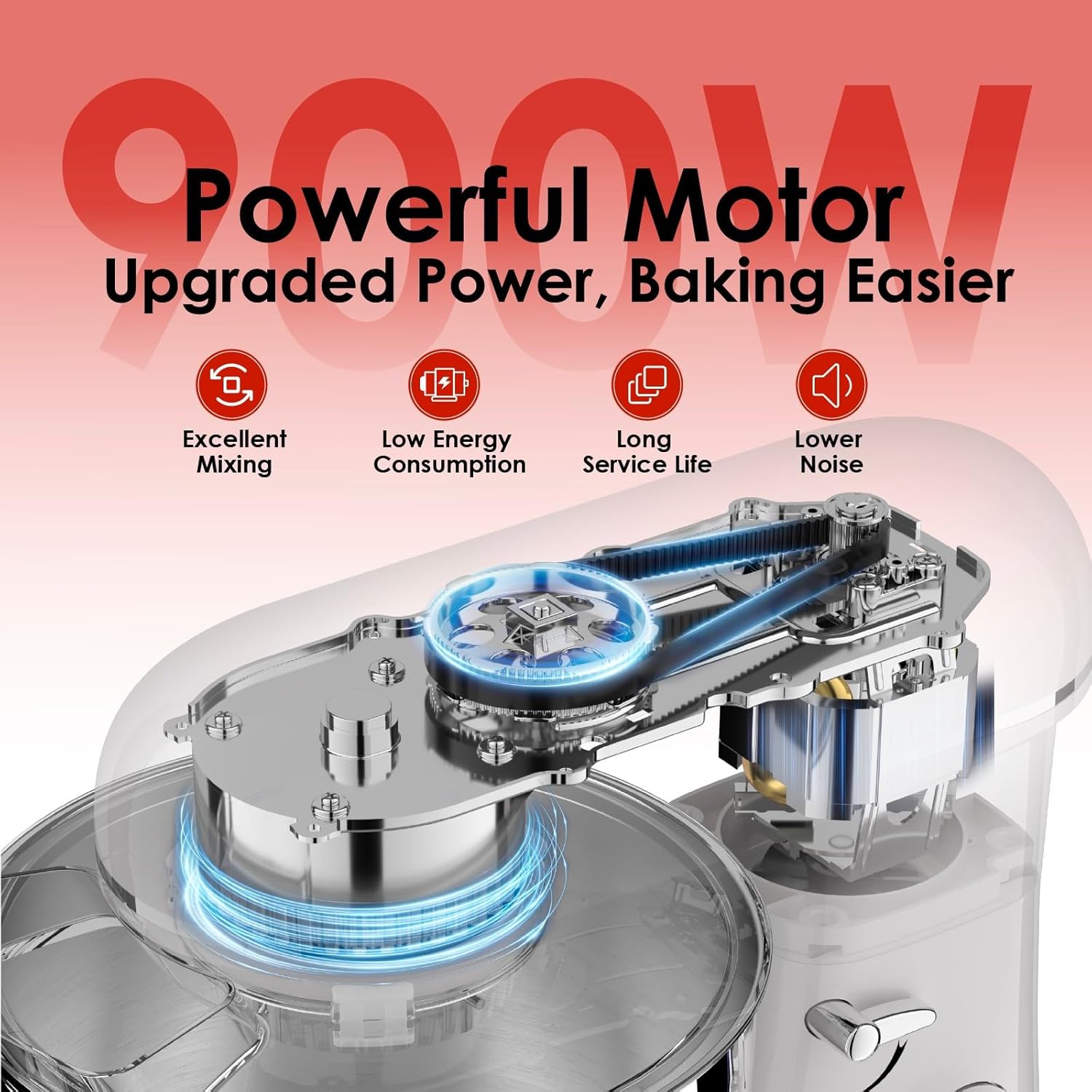 • 900W Powerful Motor: Equipped with a 900W pure copper motor, this mixer delivers robust power with smooth and efficient performance.The high-powered motor effortlessly handles heavy dough and thick mixtures while also providing precision whipping for delicate textures and consistent blending. Whether for daily use or complex baking needs, it delivers ideal results.