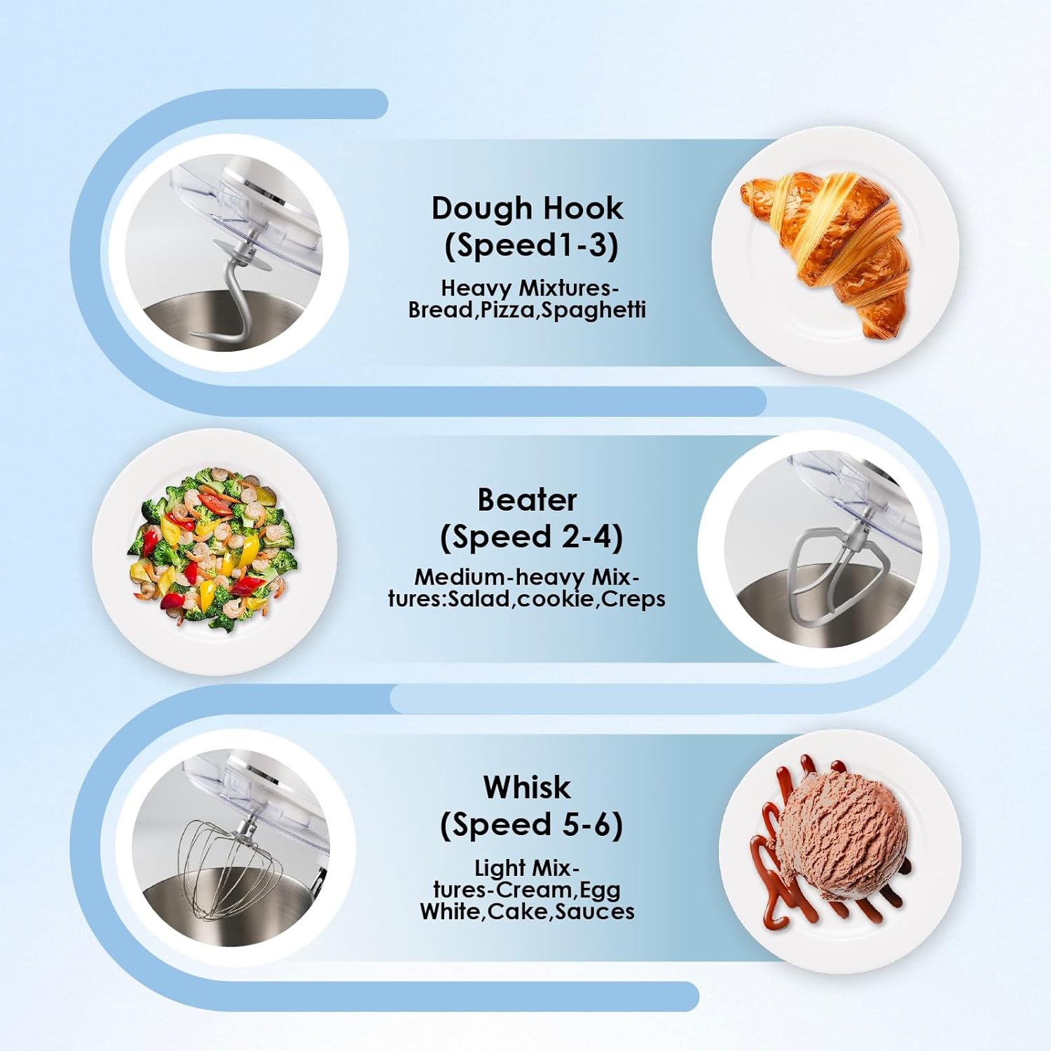 • 6 Speed, Easy to Use: This kitchen mixer features six adjustable speed settings and easy operation to meet your diverse mixing needs. The tilt-head feature allows for effortless switching between bowls and attachments.Its intuitive design ensures ease of use, making it ideal for both beginners and experienced bakers, delivering reliable performance for baking tasks.