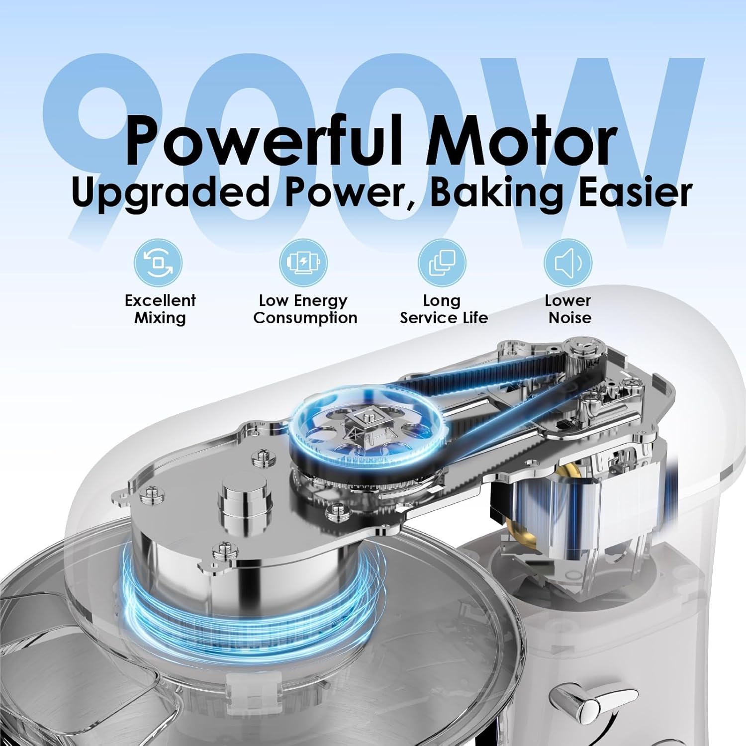 • 900W Powerful Motor: Equipped with a 900W pure copper motor, this mixer delivers robust power with smooth and efficient performance.The high-powered motor effortlessly handles heavy dough and thick mixtures while also providing precision whipping for delicate textures and consistent blending. Whether for daily use or complex baking needs, it delivers ideal results.
