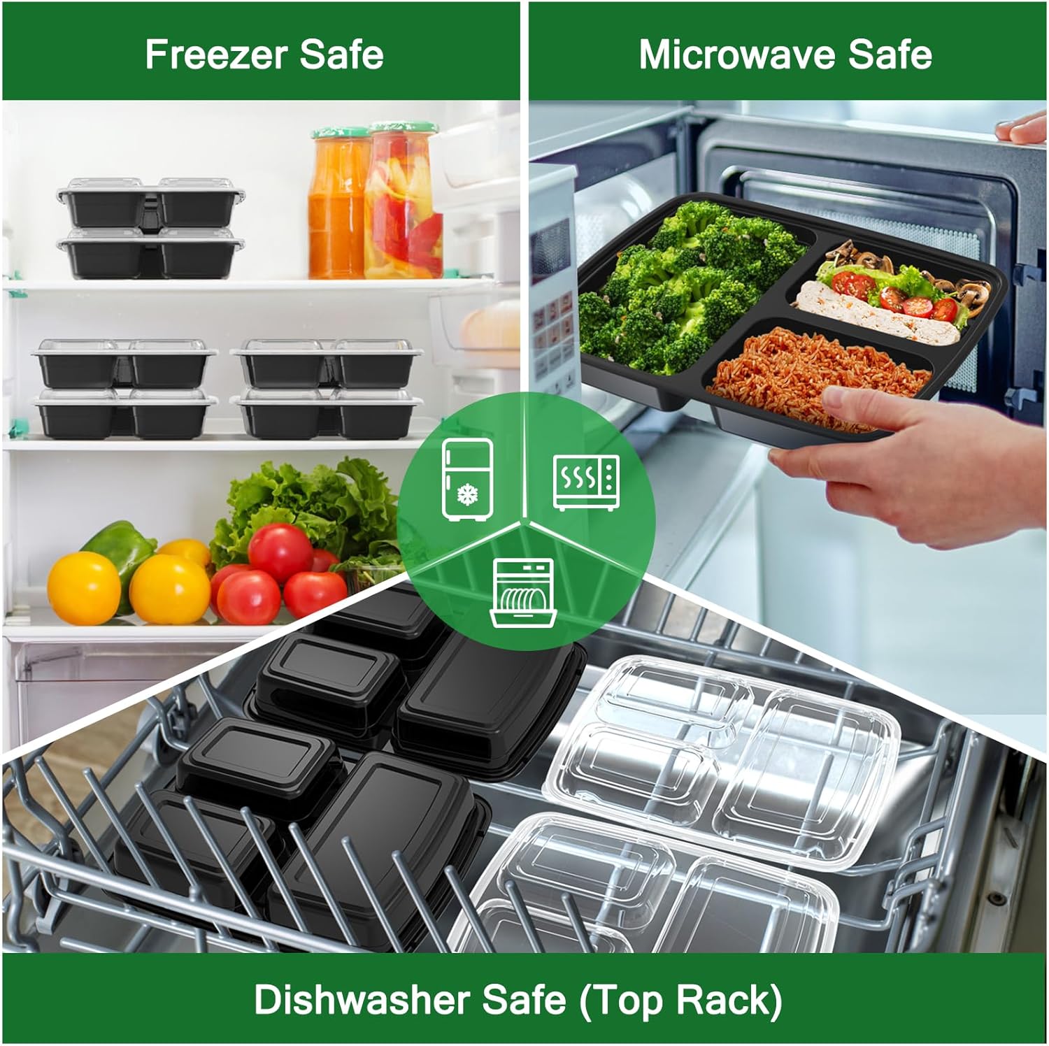 50 Pack (100-Piece) 32 oz Meal Prep Containers Reusable with Lids 3-Compartment, To Go Take Out Plastic Food Storage Containers, Sturdy Leakproof Food Safe, Microwave Freezer Dishwasher Safe, Black