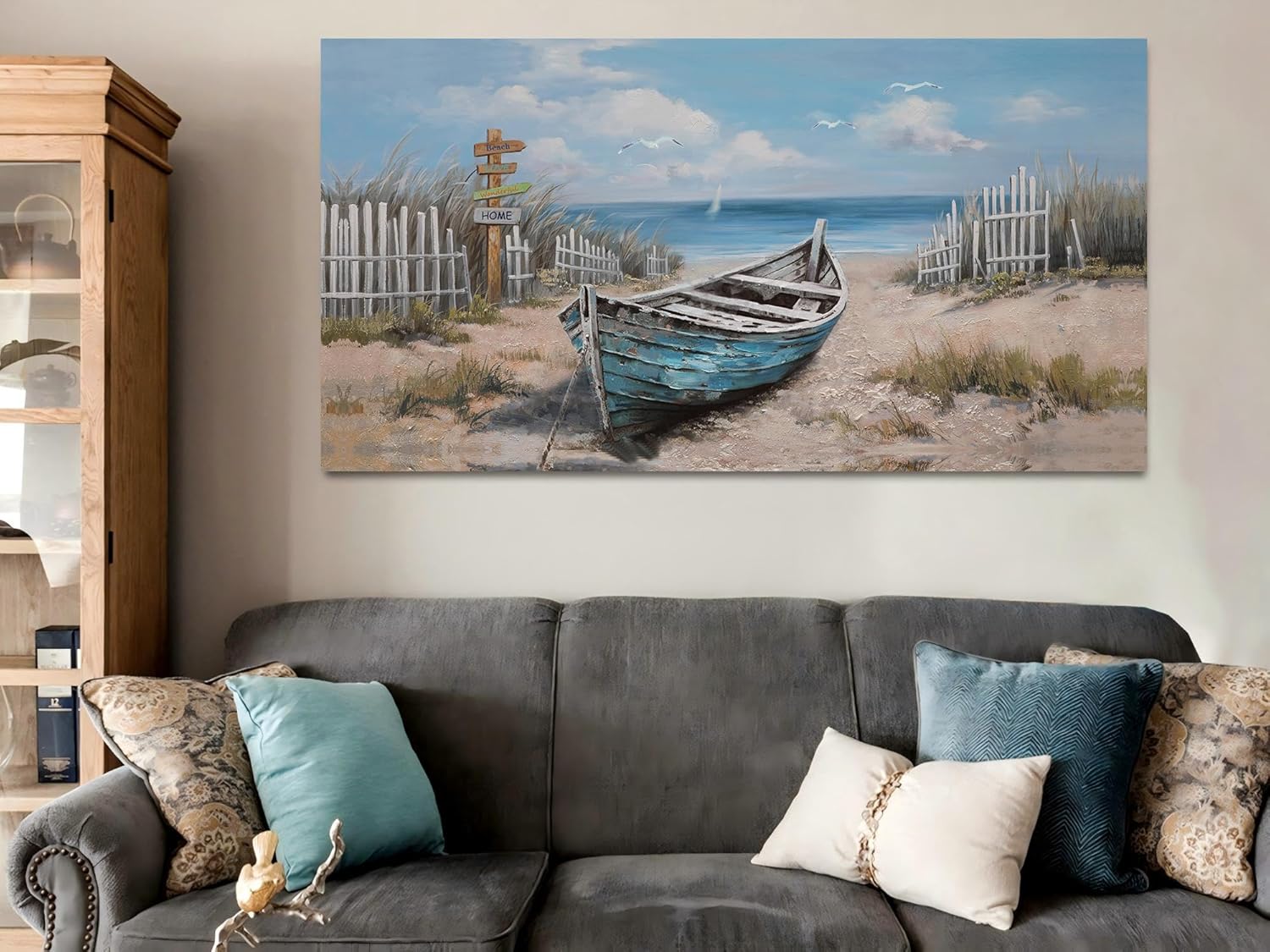 Ardemy Boat Canvas Wall Art for Living Room Large Teal Bedroom Pictures Wall Decor Textured Beach Paintings Artwork Dining Room Home Office Kitchen, 58"x29"