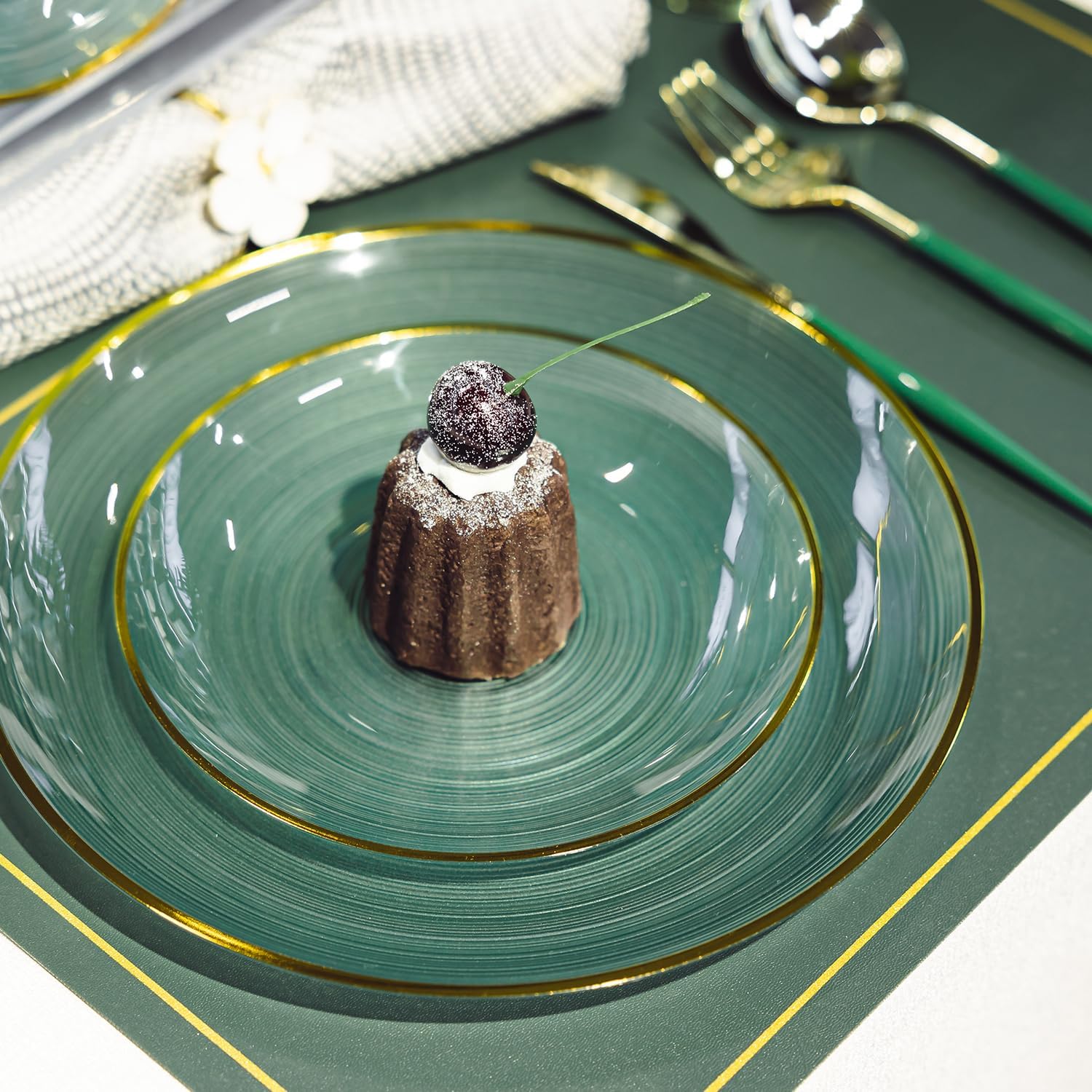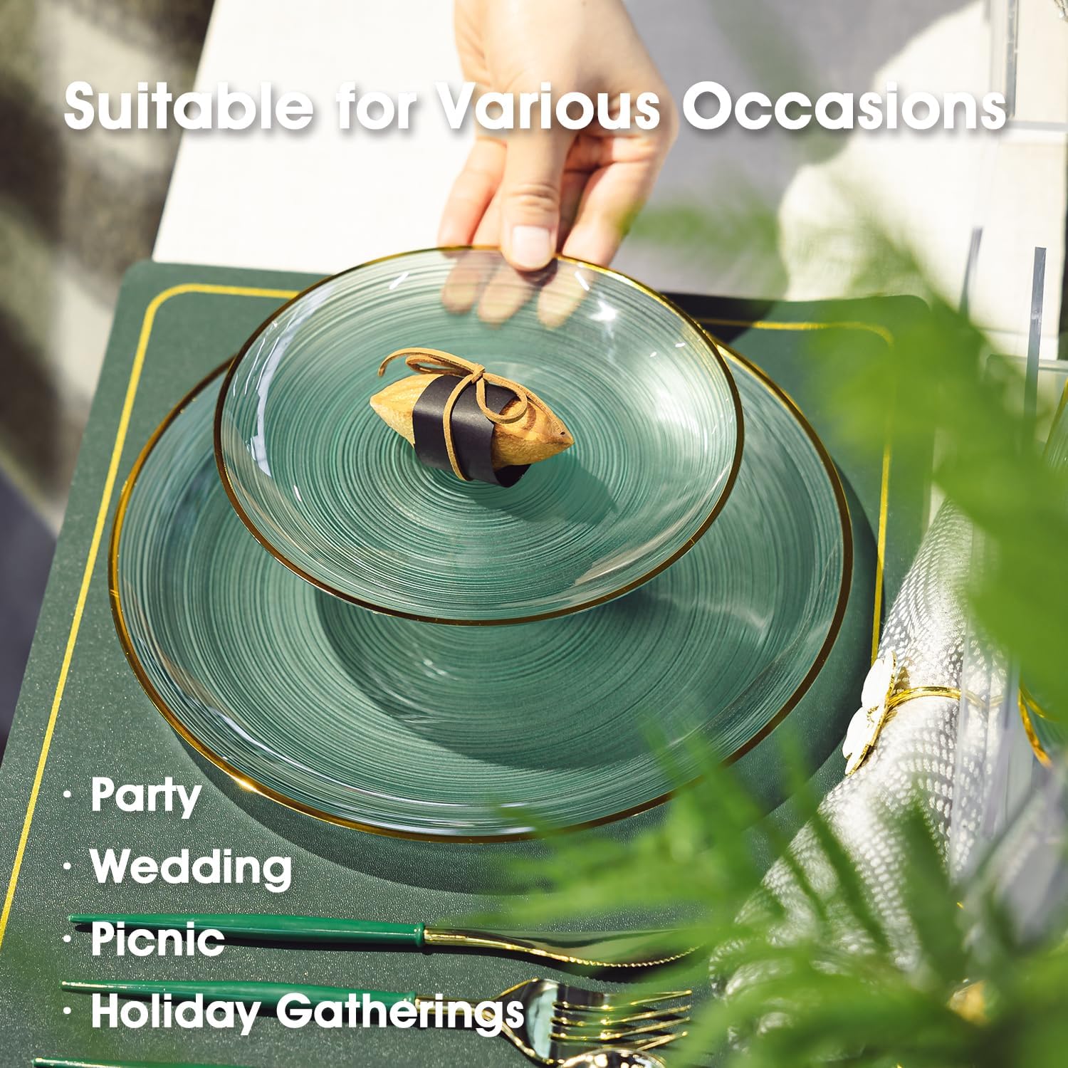 • Elegant Design:The green plastic plates with gold rim with unique spiral texture and crystal design looks modern and elegant,brings unique charm to your table and party that will surely impress your guests!