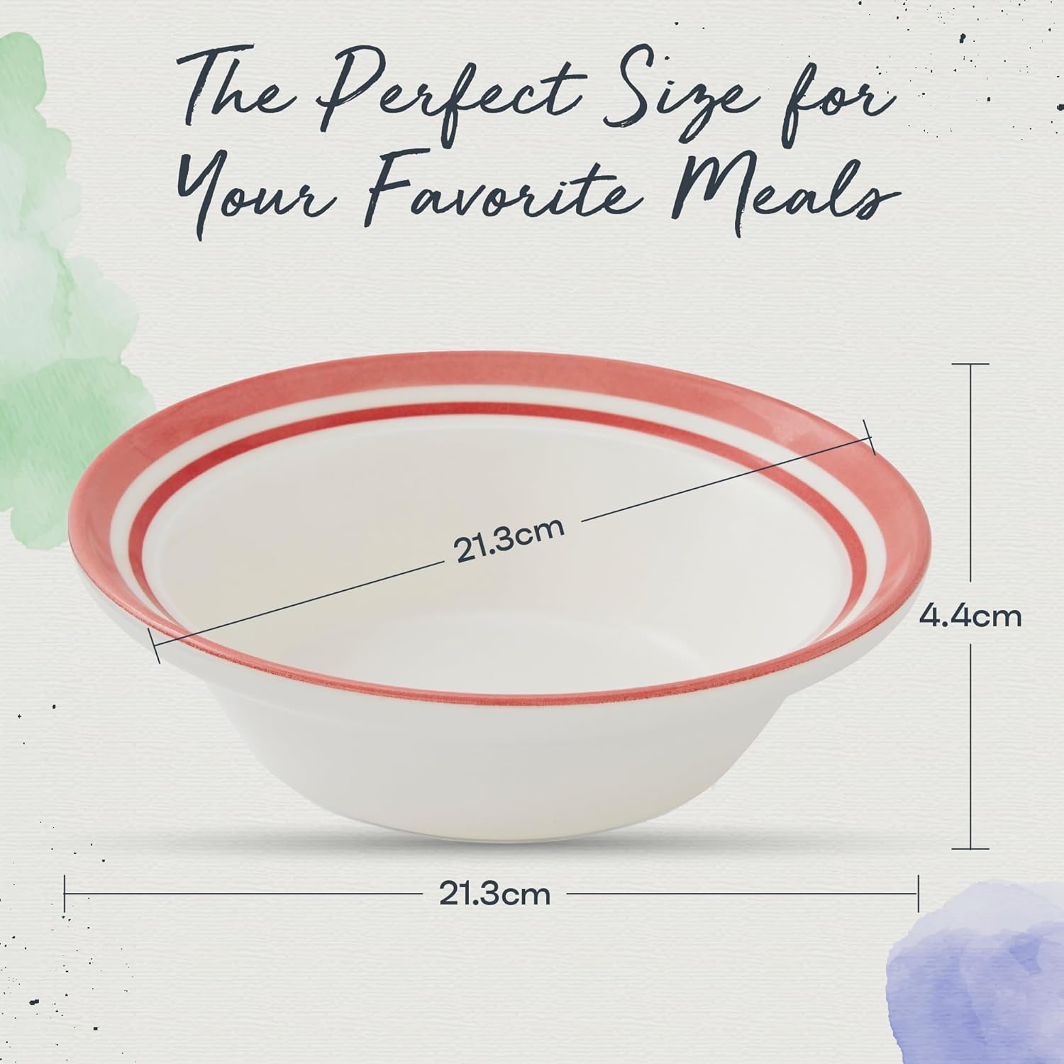 • Elegant Red Stripe Detail: These earthenware bowls feature a classic red stripe on white, a stylish addition to any dishware collection that suits both modern and traditional table settings effortlessly.