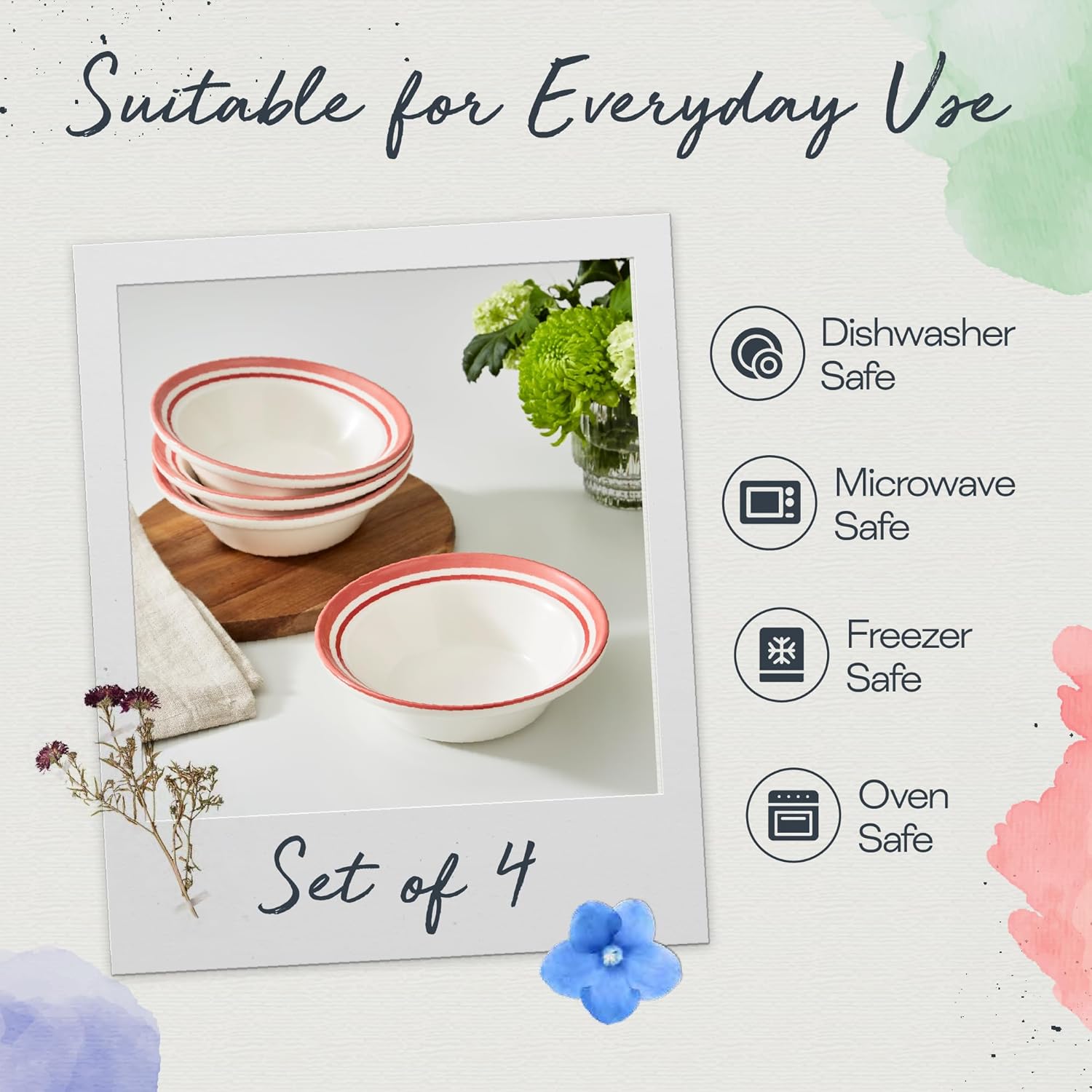 Portmeirion Potter’s Stripe Oatmeal Bowls (Set of 4) - Versatile Earthenware Bowls for Kitchen, Soups, Cereal & Desserts - Dishwasher & Microwave Safe - Made in UK Dinnerware Collection (Red Stripe)