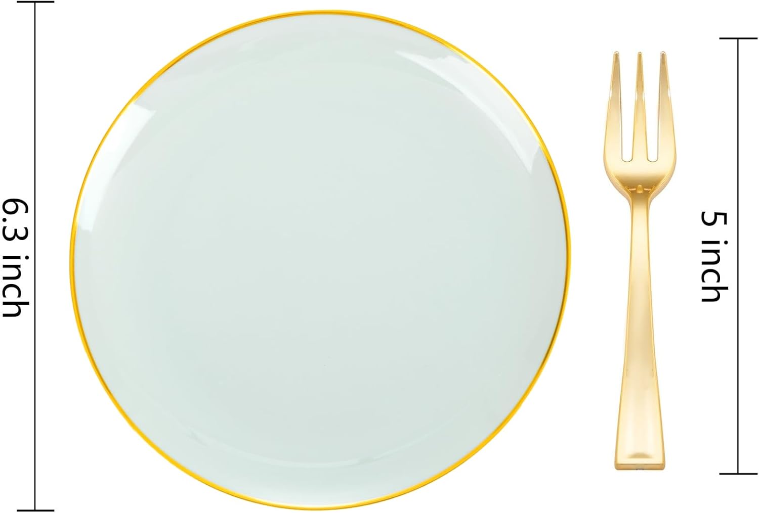 • 100 GUESTS: Sage green dessert plates set for you to prepare 100pcs 6.3 “ sage green with gold rim plastic dessert plates and 100pcs 5 " gold plastic forks, a complete set to meet the needs of 100 guests to enjoy appetizers, cakes, desserts and other delicacies, sage green disposable plates and gold forks are ideal for large banquets and parties.