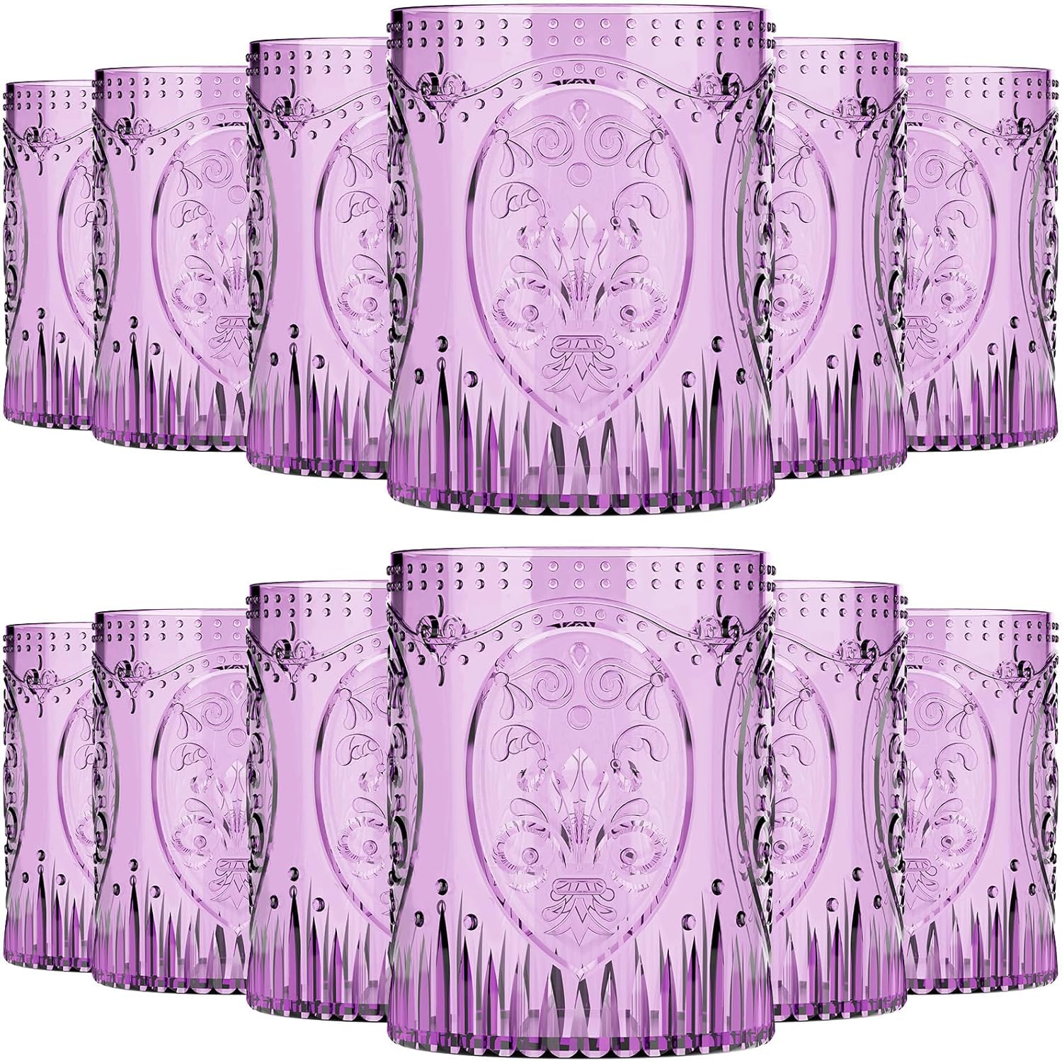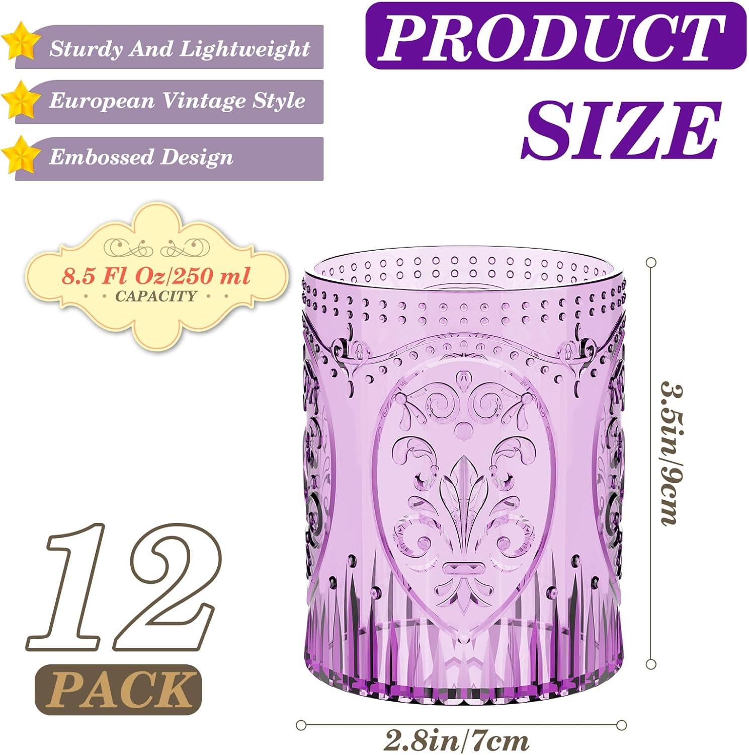 12 Plastic Vintage Drinking Glasses 8.5oz Stemless Retro Embossed Wine Glasses Shatterproof Reusable Cups for Baby Shower Wedding Reception Grand Event Party (Purple)
