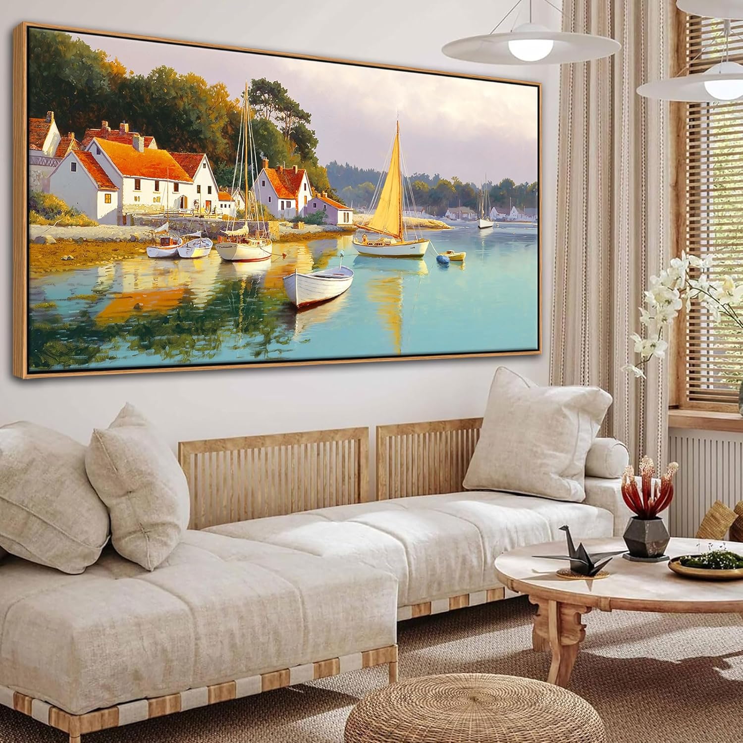 • Wall Art for Living Room Size: This 29x58 inch wall art captures the timeless beauty of ocean views and rustic boats, blending coastal and farmhouse aesthetics to bring a serene, Italian countryside feel to your living room or bedroom.