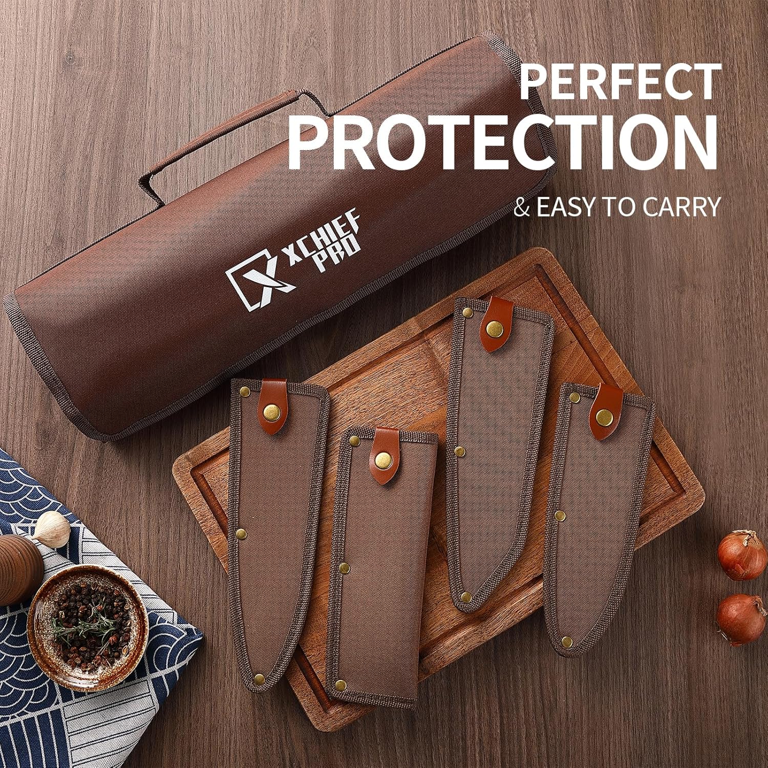 • One Set for Most Tasks: This XCHIEF PRO Chef's Knife Set includes 4 meat and vegetable cutters( 8" Kiritsuke Knife, 8" Gyutou Knife, 7" Santoku Knife, 7" Nakiri Knife), a high quality knife storage bag, poultry shears, honing steel. Designed to handle a variety of kitchen tasks such as slicing, chopping, dicing, mincing and cutting tough vegetables, thick meats, cartilage, fish, fruit and more.
