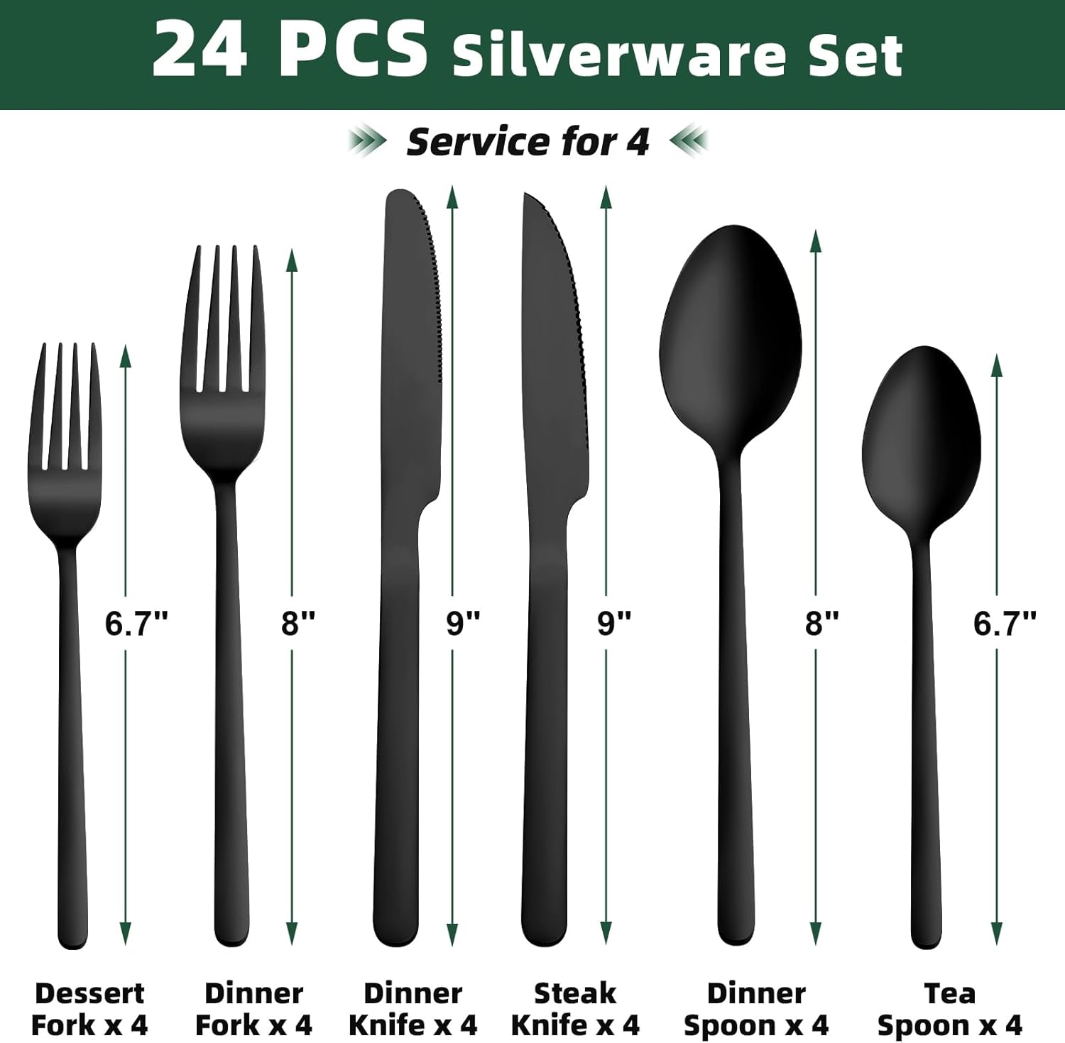 • 24 PIECES BLACK SILVERWARE SET WITH STEAK KNIVES FOR 4: This flatware set contains 4 dinner forks, 4 salad forks, 4 dinner spoons, 4 dessert spoons, 4 dinner knives and 4 steak knives. Great for home, restaurant, hotel, buffet, gathering, wedding, camping, party and entertaining. If you are going to have a picnic or a party , then this set of tableware can not only meet your requirements, but also make your dinner full of design.