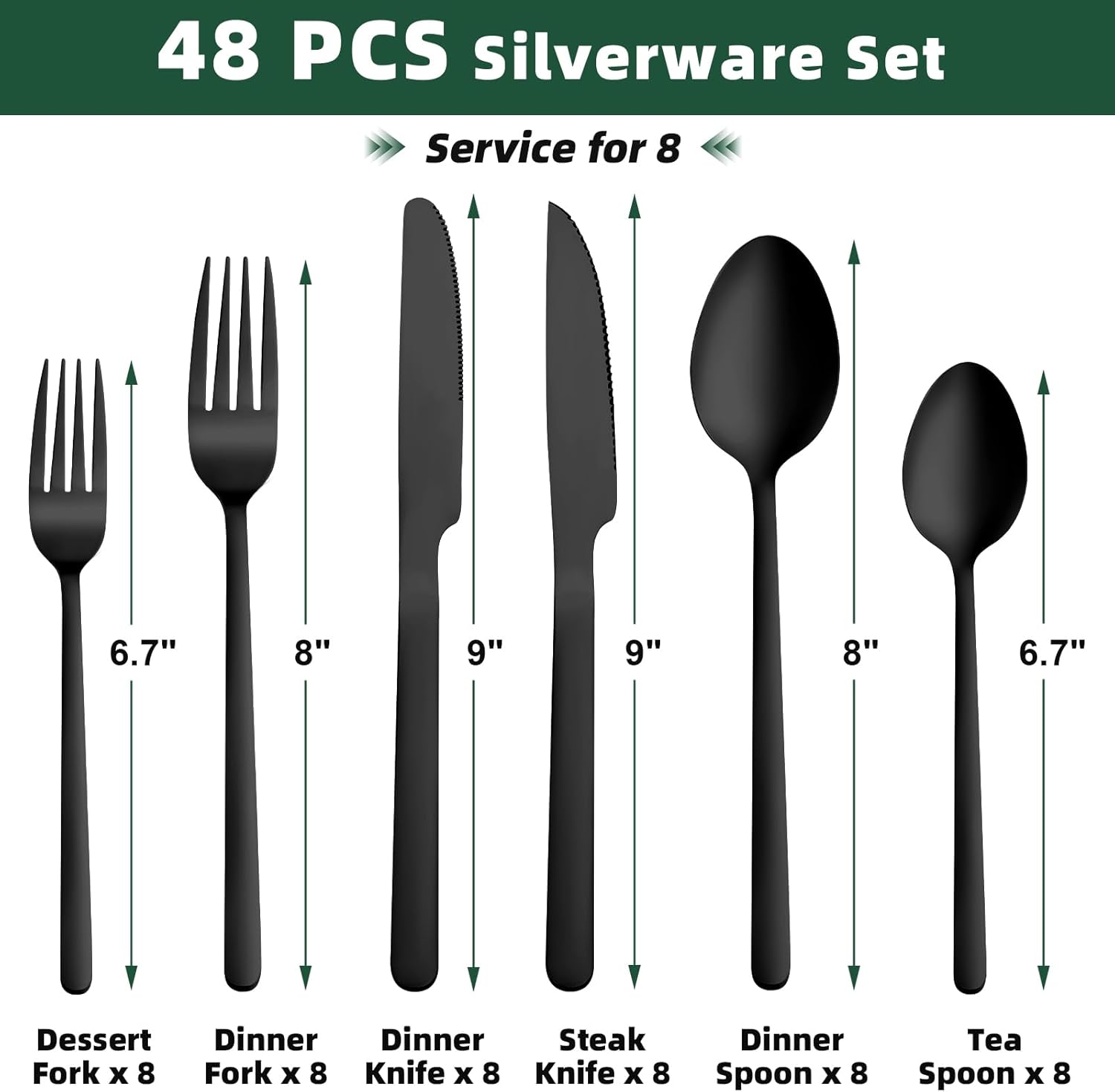 • 48 PIECES BLACK SILVERWARE SET WITH STEAK KNIVES FOR 8: This flatware set contains 8 dinner forks, 8 salad forks, 8 dinner spoons, 8 dessert spoons, 8 dinner knives and 8 steak knives. Great for home, restaurant, hotel, buffet, gathering, wedding, camping, party and entertaining. If you are going to have a picnic or a party , then this set of tableware can not only meet your requirements, but also make your dinner full of design.