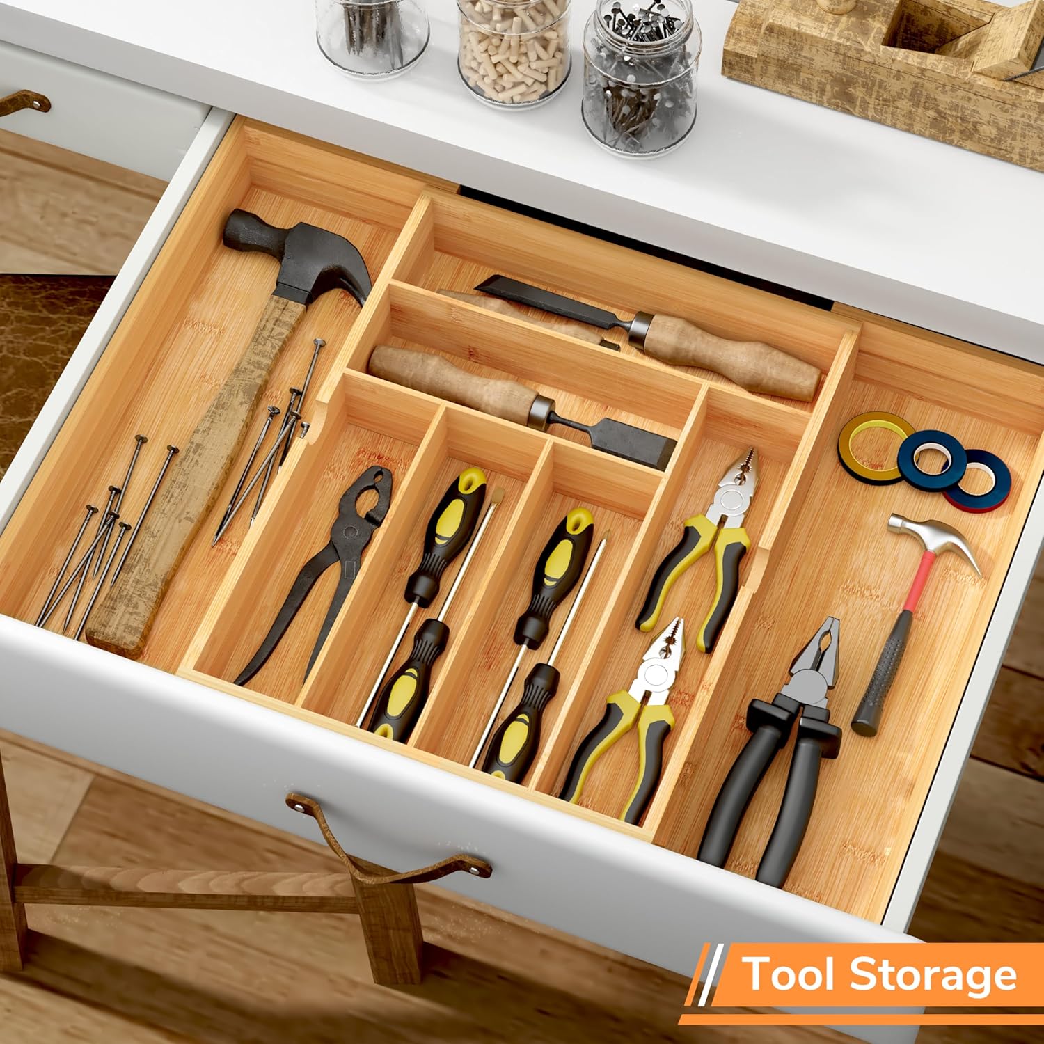 • High Quality Bamboo Material: The bamboo drawer organizer is made from high quality natural bamboo, which has a fine texture, smooth surface and warm feel; Bamboo is renewable, fast-growing, sustainable, and structurally sturdy, ensuring that the organizer will stand up to daily use and maintain its shape over time