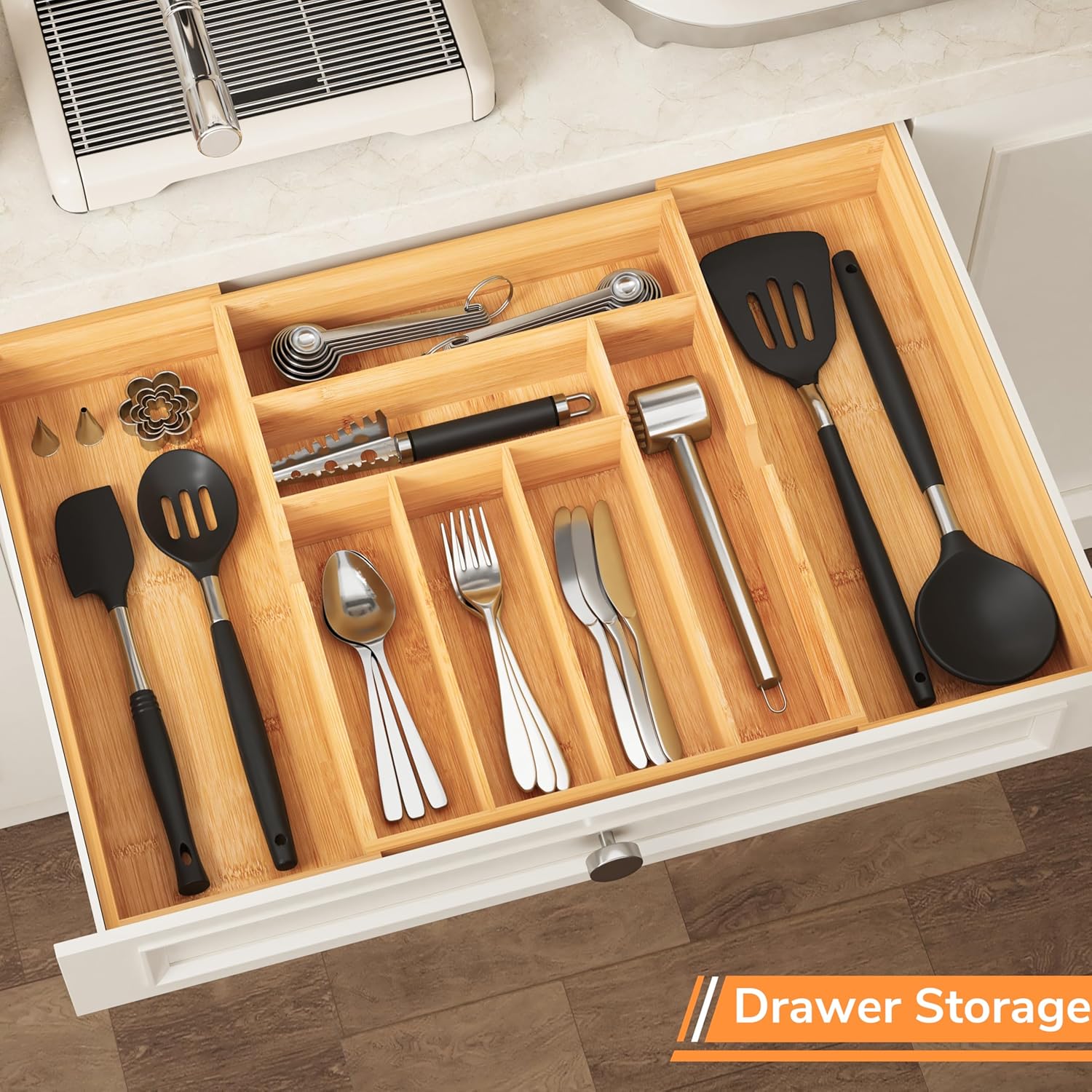 BAMEOS 3" Deepth Expandable Drawer Organizer, Deep Flatware Organizer, Adjustable Silverware Organizer, Bamboo Drawer Organizer for Kitchen, Bathroom (Natural)