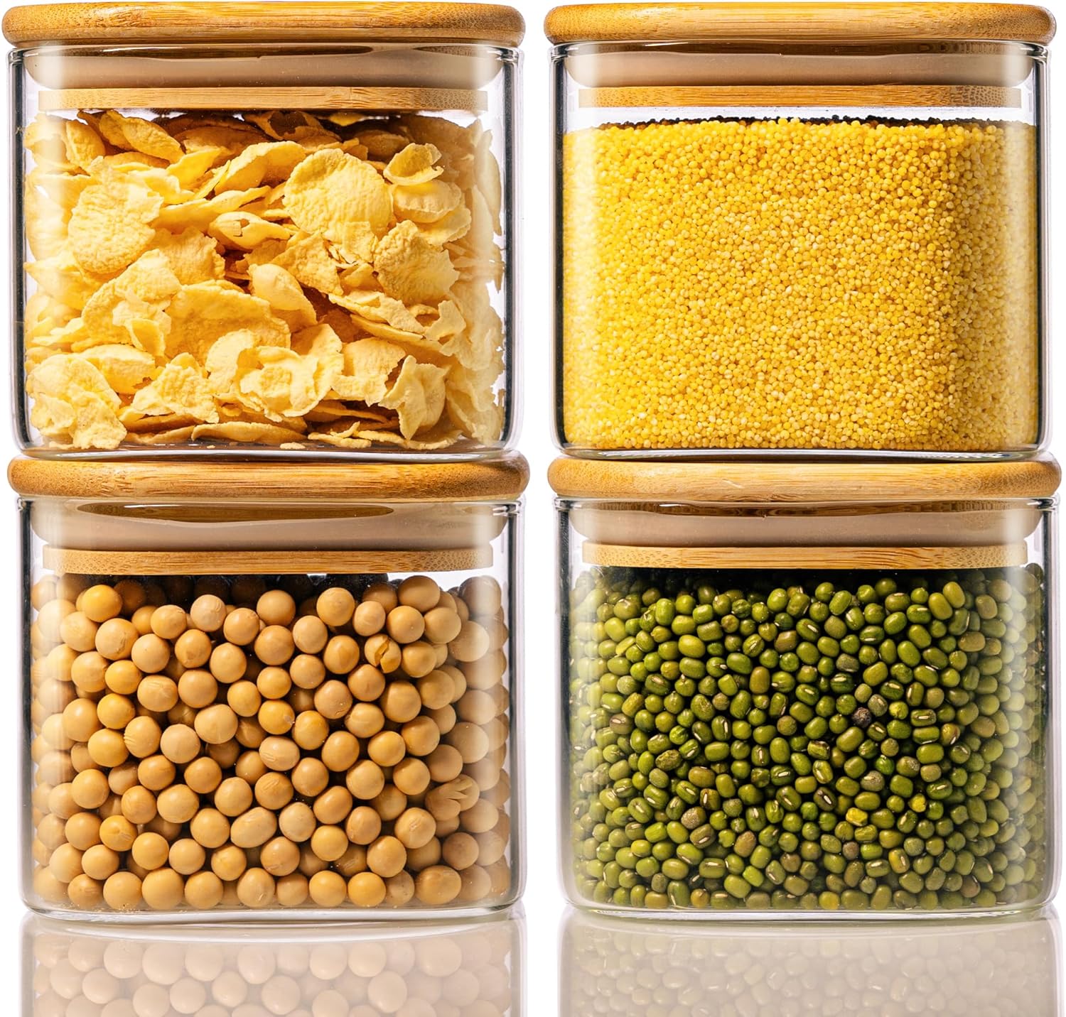 • [ Premium Glass Jars with Bamboo Lids Set of 4 ]: Square glass jars with lids set have 4 pack 21floz glass storage jars, and the size is 4.0 x 3.6 inch, suitable for salad & fruit meal prep jars, and storing various ingredients, snacks, cookie, tea, candy, oats and spices.The 21floz glass jars with airtight lids are perfect to store food for maximum freshness and convenience in cabinet and pantry. With 4" wide mouth design, which can easily take out and refill with any type of foods