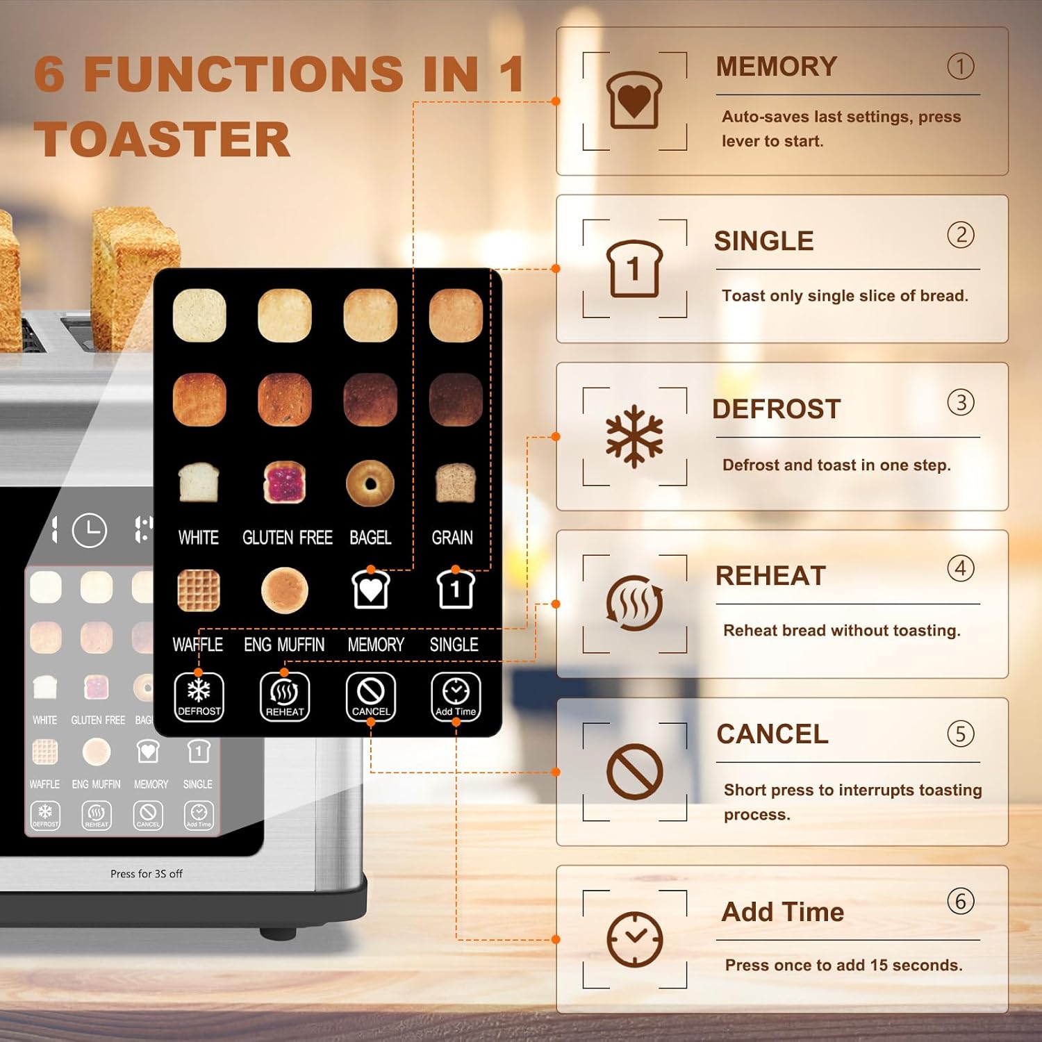 4 Slice Toaster Touch Screen, Stainless Steel Toasters Digital Timer, Dual Control Panel Toasters, 8 Shade Settings 6 Bread Types for Bagel, Cancel, Defrost 1650W
