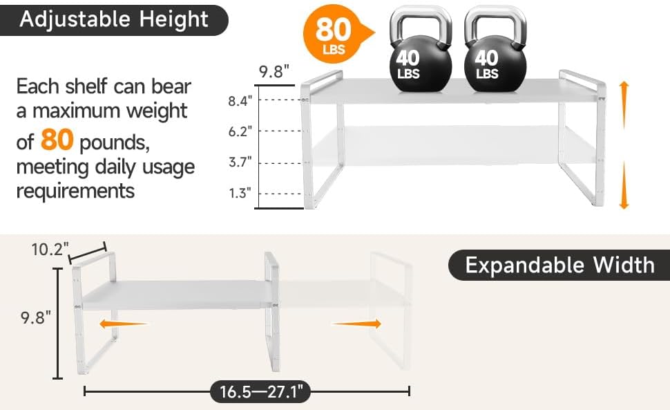 16.5~27.1" Expandable Shelf Organizer, 2Pack 8.1" Wide Stackable Cabinet Shelf Organizers, White Metal Sturdy Kitchen Counter Storage for Countertop, Adjustable Height Spice Rack