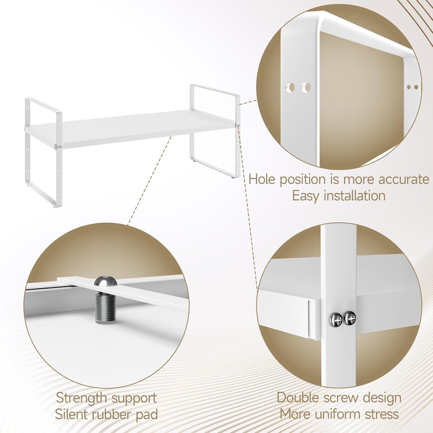 • Easy Installation and Stronger Build: The Cabinet Shelf Organizers are made of sturdy steel and coated with an eco-friendly finish that is rust-resistant, easy to clean, and prevents corrosion. The design includes additional support points on the sides for better stability and a weight capacity of up to 80 pounds.