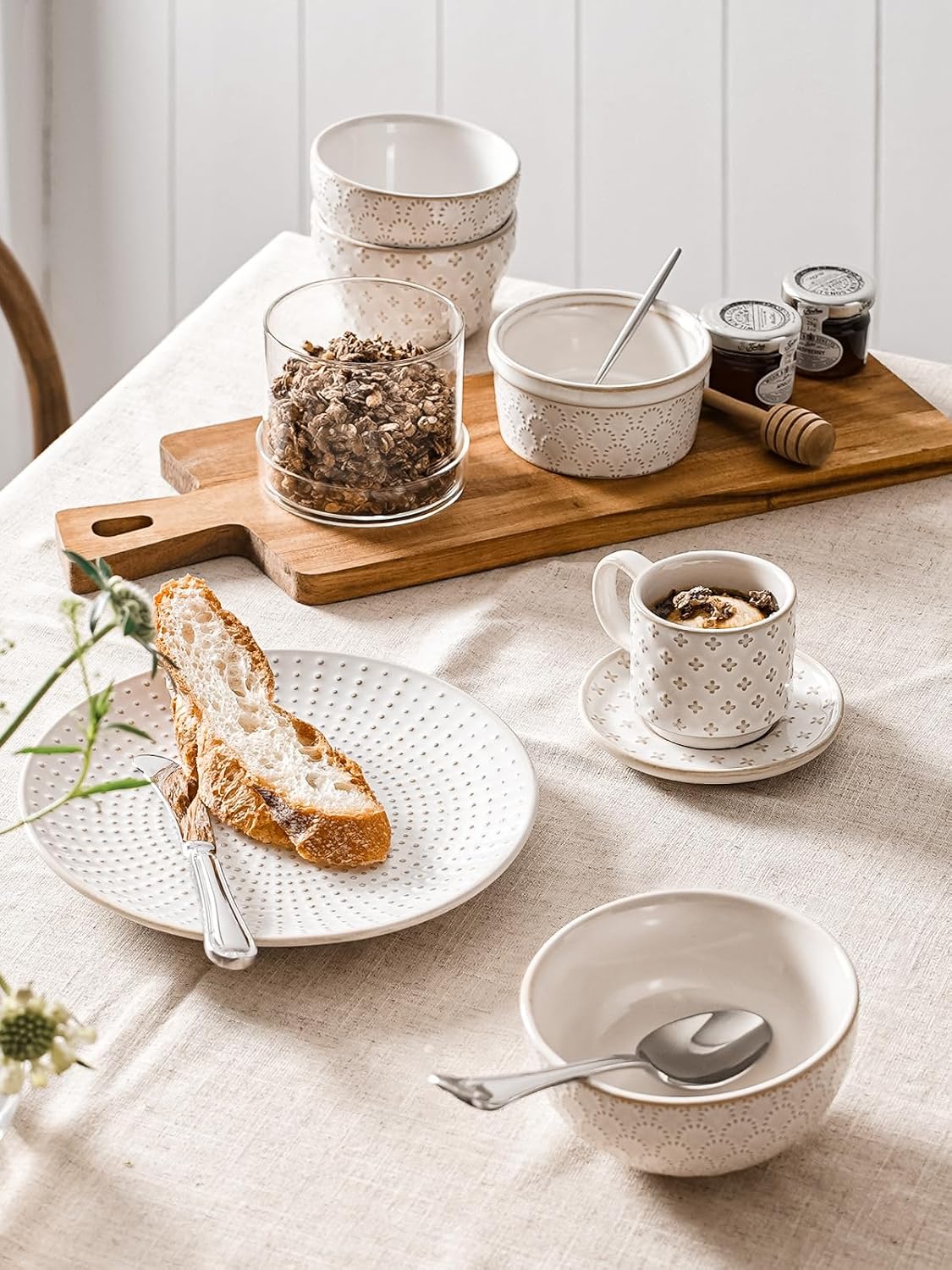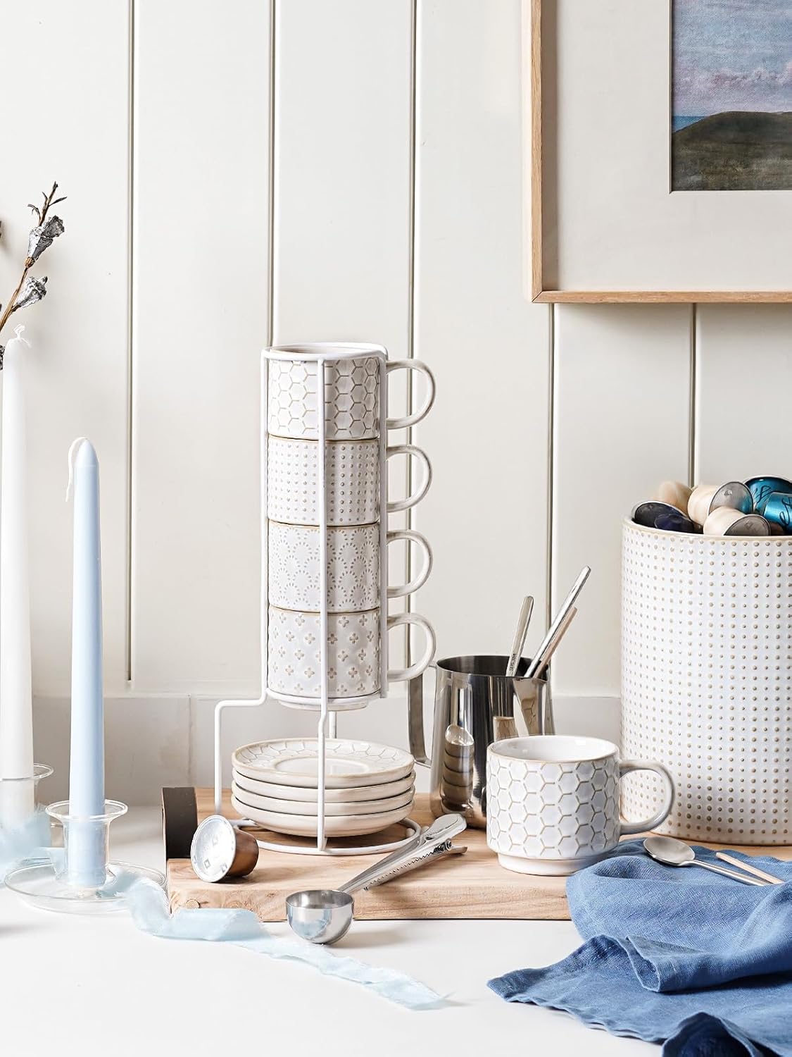 LE TAUCI Stackable Espresso Cups 4 oz with Saucers and Stand, Ceramic Embossment Coffee Cup for Double shot, Lungo, Ristretto, Dishwasher Oven Safe - Set of 4, Arctic white