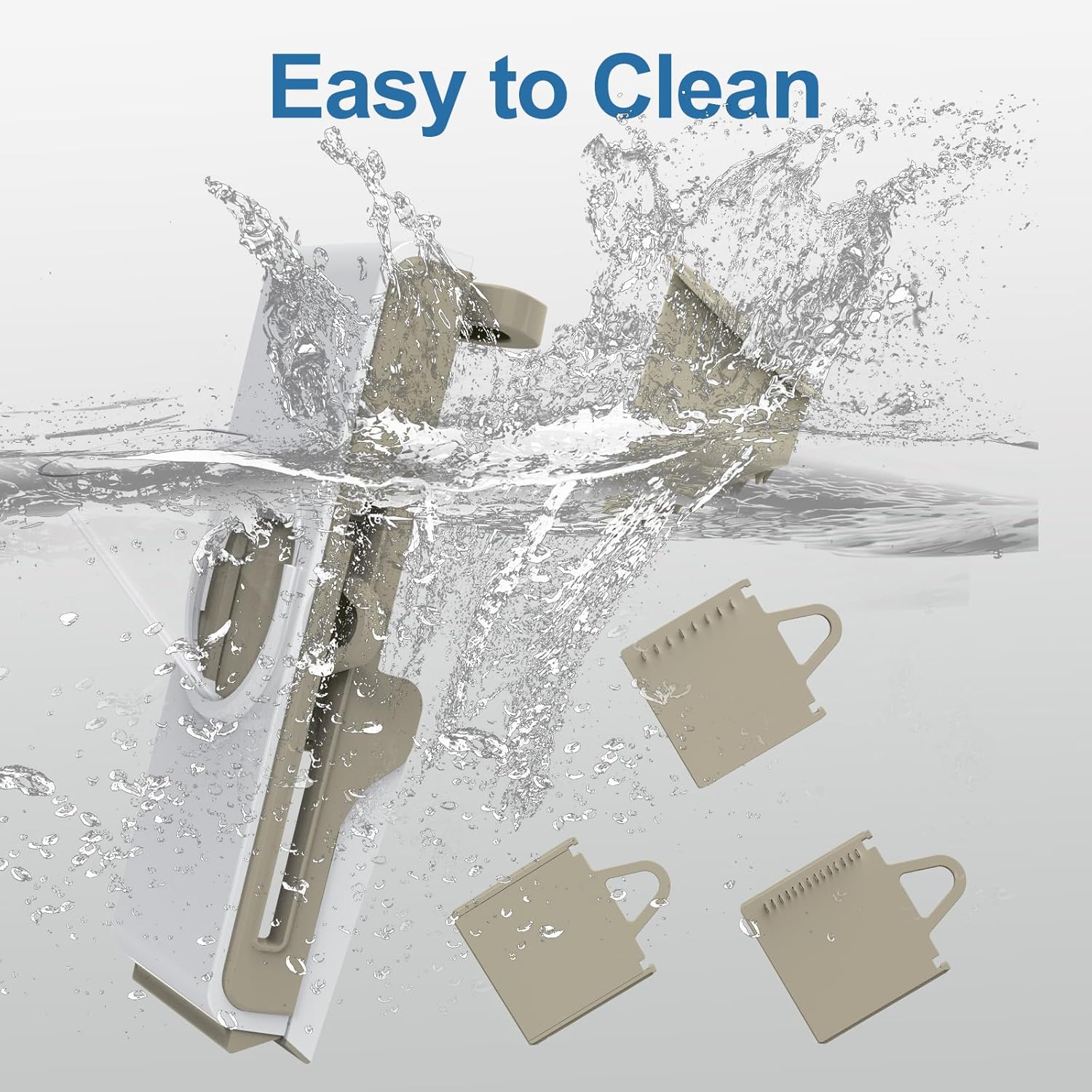 • SLIP-RESISTANT FOOD CUTTER - Ergonomic base grips counters at 15° tilt · Finger guard maintains 0.4" safety buffer · 800ml catch tray fits standard salad bowls · Disassembles in 3 clicks (non-dishwasher safe) · 91% users report <30s cleanup with included scrubber · "Cleanup? Two wipes with their veggie slicer brush" - Kitchen Hacks Star